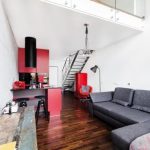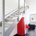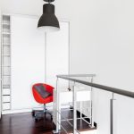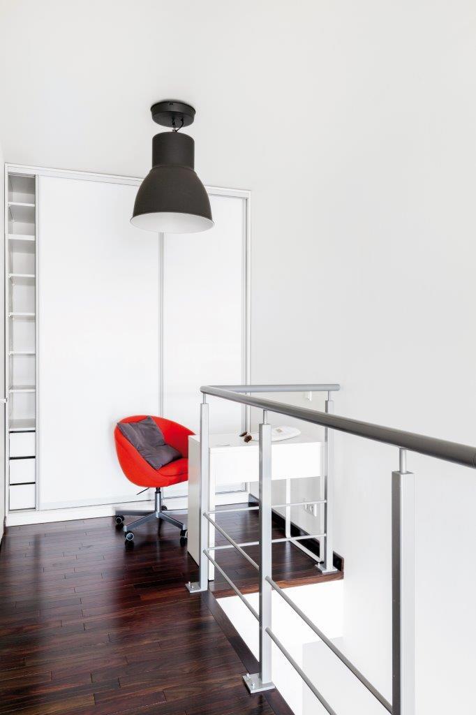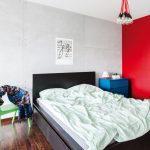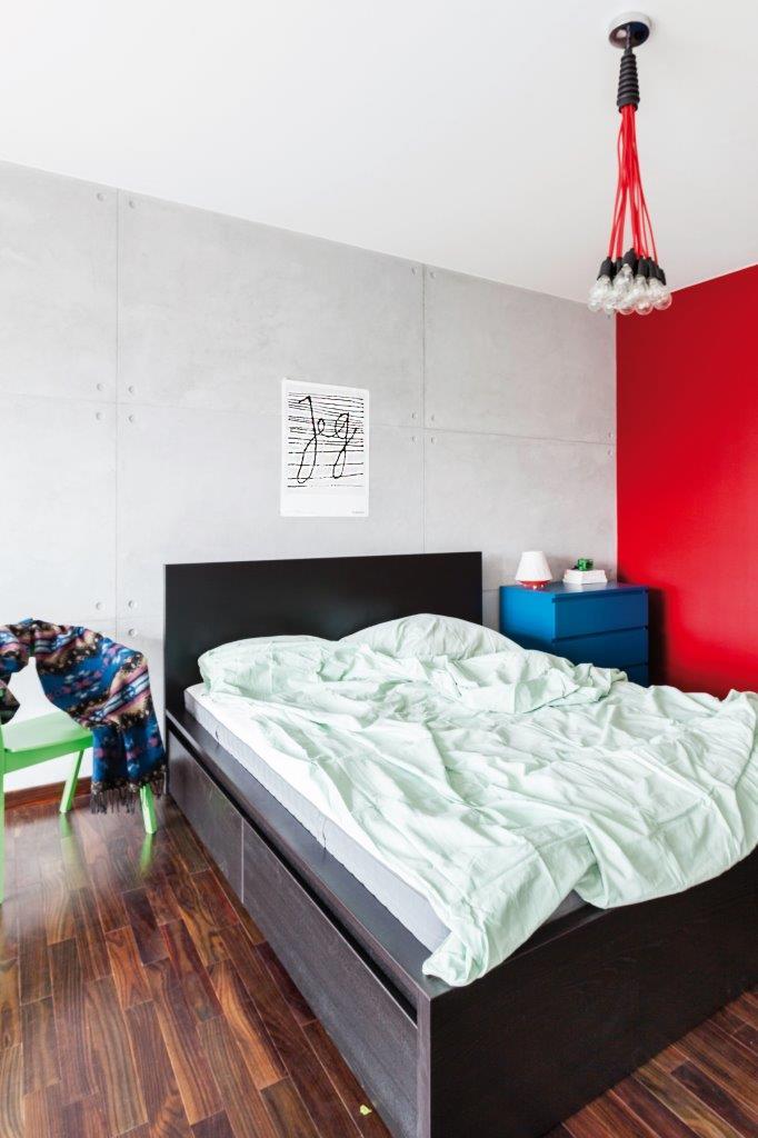 W sypialni widzimy ciąg dalszy elementów z pierwszego poziomu intensywna czerwień na ścianie i równie surowe oświetlenie. Na tym poziomie udało się wygospodarować miejsce do pracy i szafę. W sypialni znalazło się łóżko w kolorze ciemnego drewna. Meble mogą z pozoru wyglądać na przypadkowe niebieska komoda, zielone krzesło jednak jest to przemyślana, eklektyczna kompozycja, która ma wprowadzić do wnętrza więcej koloru.