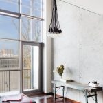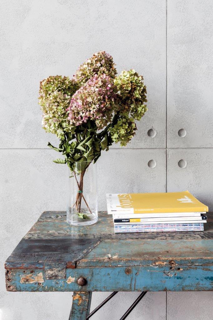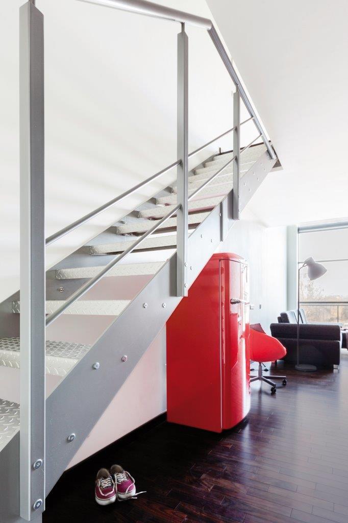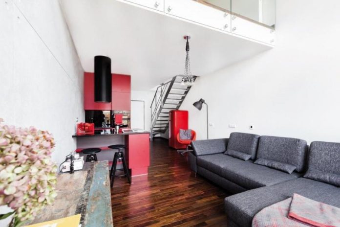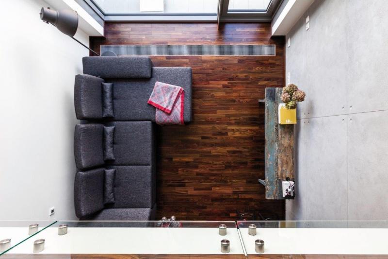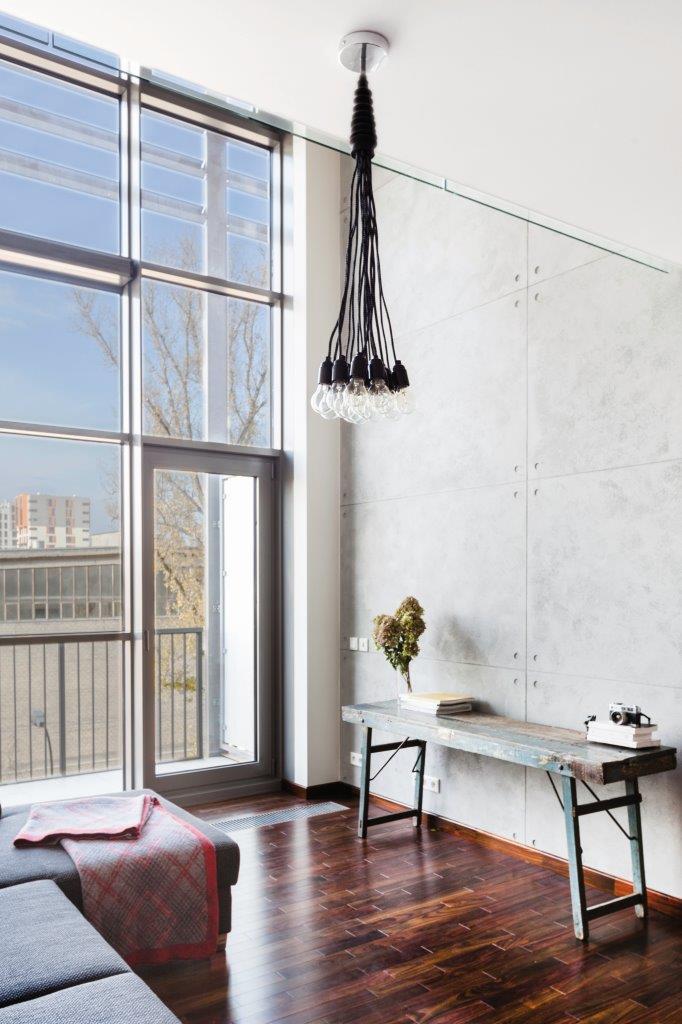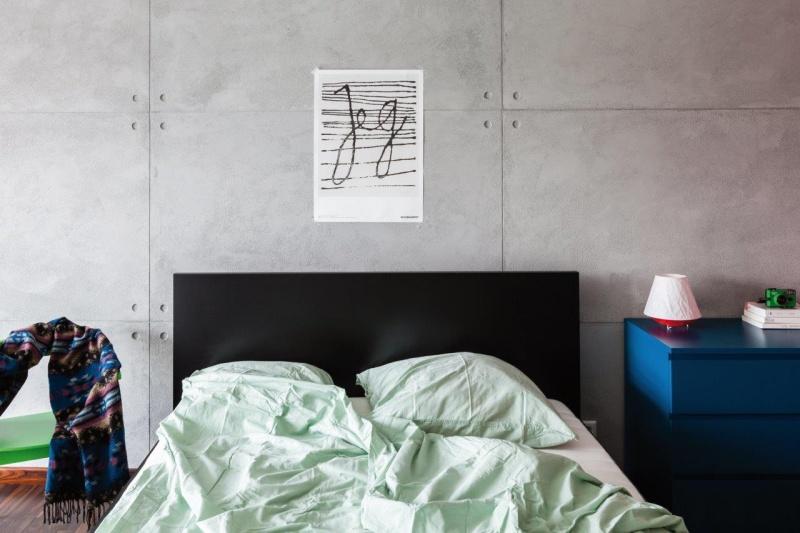 Na pierwszy rzut oka uwagę w mieszkaniu przykuwa ściana wykończona specjalnym tynkiem dekoracyjnym o strukturze betonu architektonicznego. Zostały na niej odwzorowane szczeliny oraz otwory imitujące ślady po szalunku w prawdziwym betonie. Betonowa” ściana jest wysoka na dwie kondygnacje, tworząc w ten sposób spójną przestrzeń salonu, kuchni i sypialni. Industrialnym łącznikiem pomiędzy dwoma poziomami są również surowe schody wykonane ze stali.