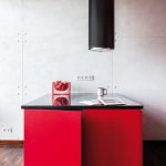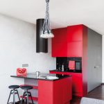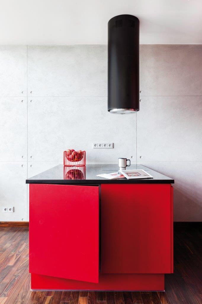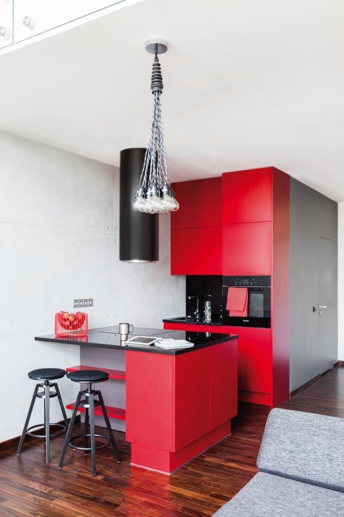 Duet idealny czerwienie z czernią. Salon płynnie przechodzi w aneks kuchenny, który odcina się intensywną czerwienią mebli od reszty mieszkania. Zabudowa kuchenna zaprojektowana została jako półwysep z barem, przy którym podczas śniadania można usiąść na jednym z czarnych stołków. Czerwień kuchni idealnie łączy się z czernią blatu, obudowy piekarnika, zlewu i okapem typu tuba. Dopełnieniem wnętrza kuchennego jest lodówka w stylu retro. Pełni ona w równej mierze funkcję użytkową, jak i dekoracyjną. Oświetlenie w kuchni jest równie minimalistyczne, jak całe wnętrze kilkanaście żarówek w pęku na grubych kablach.