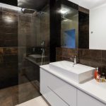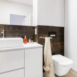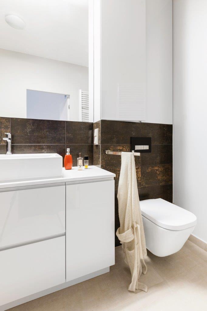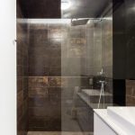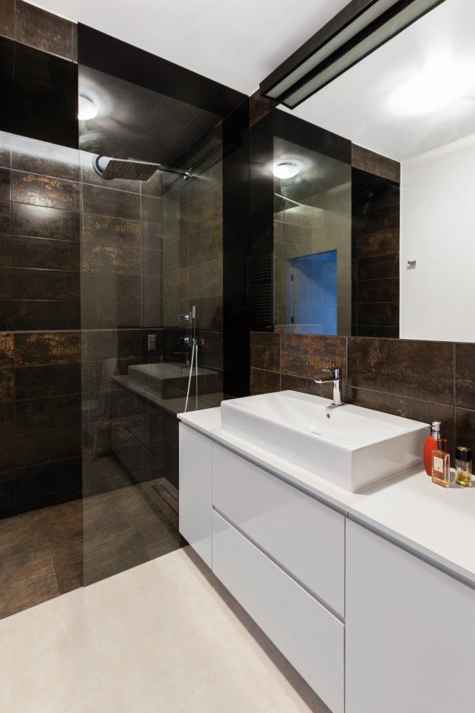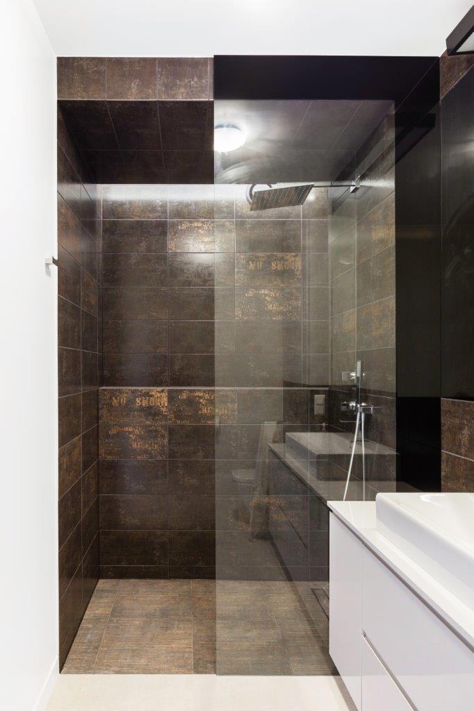 Łazienka w stylu punk. W mieszkaniu znajdują się dwie łazienki, po jednej na każdym piętrze. Na dole jest toaleta, a na górze łazienka z prysznicem. Chcąc po raz kolejny podkreślić spójność wnętrza w obu pomieszczeniach, użyto tej samej kolekcji płytek. W zestawie znajdziemy standardowe jasnoszare kafelki, jak i płytki w kolorze brązu z rdzawymi przetarciami, które dodają łazience industrialnego pazura. Kolekcja uzupełniona jest dekorami z przetartymi napisami. Prysznic został oddzielony od reszty pomieszczenia ciemną płytką na podłodze. Zastosowano tu również bardzo wygodne i coraz bardziej popularne rozwiązanie, jakim jest odpływ liniowy pod prysznicem, dzięki czemu tradycyjny brodzik staje się zbyteczny, a w zastępstwie kabiny jest jedynie przestrzeń wydzielona szklaną ścianką.