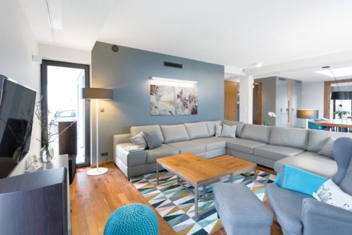 Układ wnętrz został ściśle przemyślany według życzeń i marzeń domowników. Dom został podzielony na trzy strefy: dzienna, rodziców oraz dzieci. Do domu prowadzi przeszklony hall z garderobą. Sercem domu jest strefa dzienna, która mieści się w centralnej części. Salon połączony z jadalnią tworzy 65 m2 otwartej przestrzeni. Za przesuwnymi szklanymi drzwiami została usytuowana kuchnia. Strefa dzieci jak i rodziców została wyposażona w prywatne łazienki oraz dostęp do tarasów zewnętrznych. We wszystkich wnętrzach został użyty tytułowy orzech amerykański. Drewno o ciekawym usłojeniu oraz wielu odcieniach. Takie rozwiązanie dodaje wrażenia ciepła, na czym szczególnie zależało klientom. Przede wszystkim jako materiał naturalny jest ponadczasowym akcentem, który dopełniają delikatne odcienie szarości, bieli oraz grafitu. W części wypoczynkowej znalazła miejsce sofa modułowa w układzie litery u, na ścianie okładzina w formie grafitowej tkaniny mieni się ołówkowym grafitem. Dla przełamania barw na drewnianej podłodze geometryczny dywan. Kominek w wersji minimalistycznej to ściana tynku dopełniona plastrem spieku kwarcowego, który mieni się rdzawymi odcieniami oxido. Wygodny fotel z podnóżkiem formą odbiega od stylistyki wszystkich mebli. Jednocześnie jest ciekawym akcentem, który zwraca uwagę.