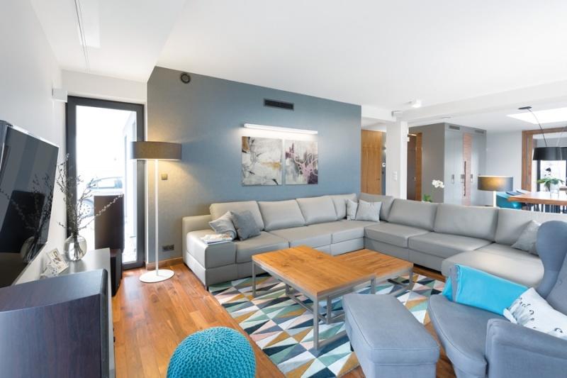Nad częścią jadalnianą bije łuna dziennego światła – to świetlik dachowy, dzięki któremu to miejsce zyskuje dodatkową wartość. Centralnie pod przeszkleniem, niczym odbicie lustrzane, mieści się stół z drewnianym blatem, uzupełniony o różnobarwne kubełkowe fotele. Całość wieńczy kompozycja ruchomych lamp, które lewitują nad całością. Na środku multi szafa pełniąca funkcje parawanu dzielącego jadalnie od komunikacji, dodatkowo dwustronnie wykorzystana na wszelkie schowki. Duże przeszklenia są przedłużeniem strefy dziennej. Wyjście na taras uzupełnione egzotyczną deską optycznie wydłuża przestrzeń sprawiając wrażenie jadalni wychodzącej na ogród.