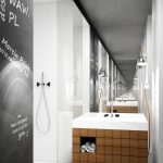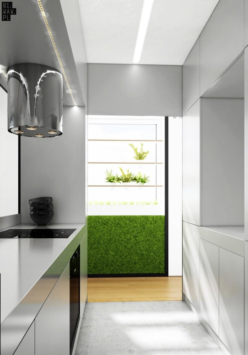 Kuchnia oraz WC dla gości zostały wpisane w bryłę, która sprawia wrażenie, jakby była wstawiona w środek strefy dziennej. Została ona otoczona szarymi, matowymi płytkami. Kubik od strony salonu posiada duże wcięcie, co pozwala na płynne przejście kuchni w salon. Fronty szafek kuchennych wykończone są białym lakierem. – Wnęka za zlewem zyskała na praktyczności dzięki pokryciu jej tablicową farbą – dzięki niej można pisać na ścianie kredą zupełnie jak na tradycyjnej tablicy – podkreśla Anna Paszkowska-Grudziąż, architektka z pracowni 81.WAW.PL. – Takie rozwiązanie jest świetne dla zapominalskich, można np. na bieżąco notować listę zakupów – dodaje.
