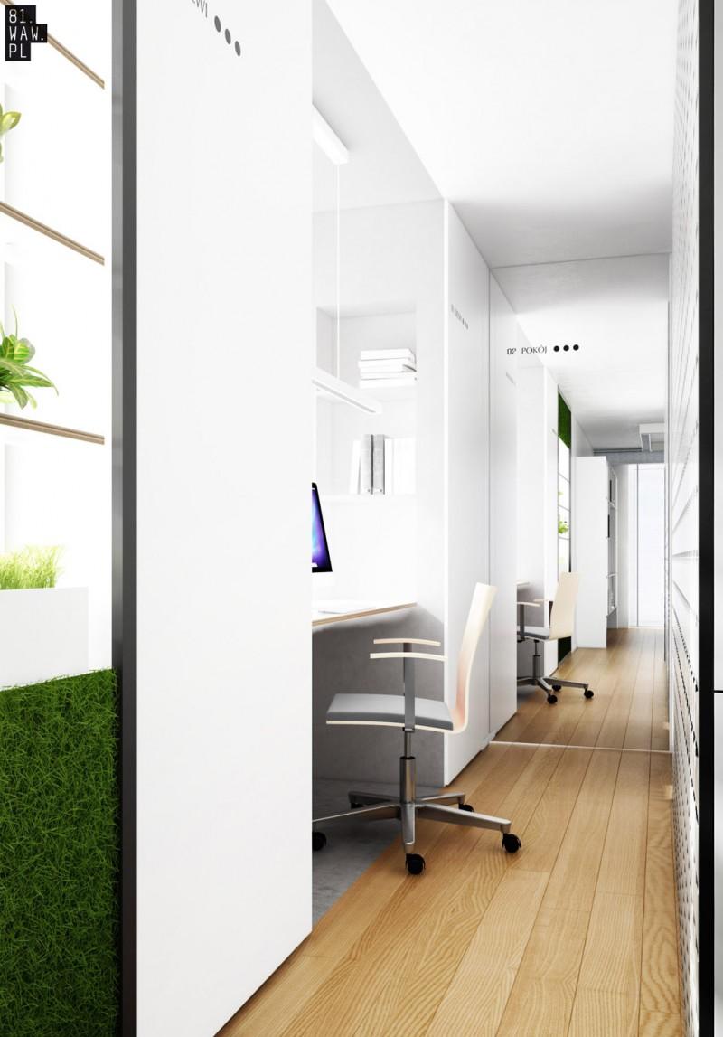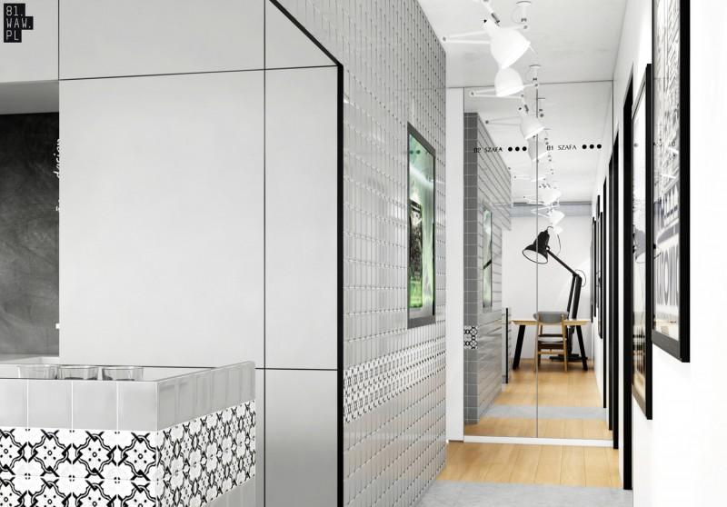 Po jednej stronie szarej kostki znajduje się główne wejście do mieszkania. Ściana prowadząca od wejścia do części dziennej pokryta została starymi plakatami w czarnych ramach. Takie samo obramowanie mają także drzwi wejściowe. Po drugiej stronie bryły mieści się wspominany już minigabinet, który został zlokalizowany przy oknie. Dzięki wydzieleniu kącika do pracy drzwiami przesuwnymi, w dowolnej chwili może tworzyć zamknięty pokoik pracy, a gdy nie ma takiej konieczności – stanowi on część otwartej przestrzeni dziennej.
