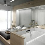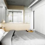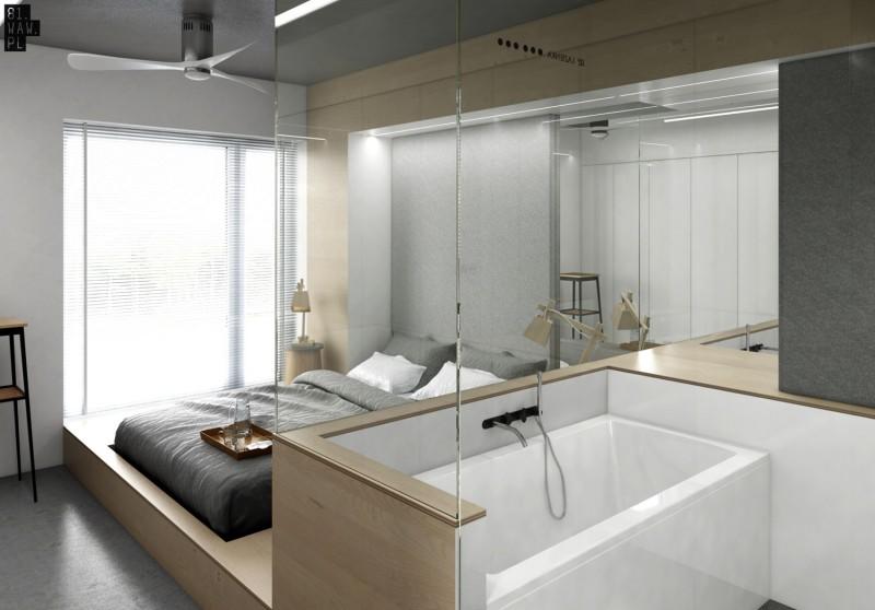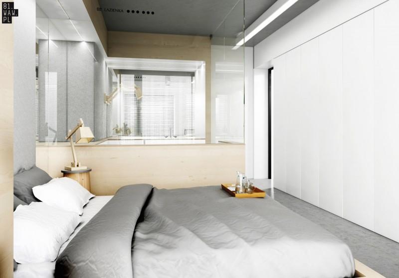 Strefa dzienna to nie tylko kuchnia i gabinet, to także przestronny i wielofunkcyjny salon. Na jednej ze ścian znajduje się biały regał na sprzęt RTV, ale dzięki dużej liczbie półek może być także idealną biblioteczką. W centralnej części pokoju mieści się kanapa modułowa, która dzięki swojej budowie jest łatwa w przesuwaniu, a co za tym idzie, pozwala na szybką zmianę aranżacji salonu. Podczas spotkań rodzinnych lub w gronie przyjaciół łatwo zamienia się miejscami ze stołem stojącym pod ścianą, który w takich sytuacjach stanowi centralny punkt pokoju. – Ściana, która mieści się po przeciwnej stronie części dziennej, została w całości obłożona lustrami. Taki zabieg doskonale powiększa wnętrze mieszkania oraz pozwala sprytnie ukryć drzwi do innych pomieszczeń – zaznacza Rafał Grudziąż, współautor projektu. Jednym z nich jest łazienka gościnna, która została zaaranżowana w bardzo nietypowy sposób. Uwagę zwraca przede wszystkim nietypowa szafka pod umywalkę, która w niczym nie przypomina tych tradycyjnych. Bardziej przywodzi na myśl elegancką drewnianą komodę w kolorze olchowego drewna, której fronty wykonano z drobnych kwadratów. Podłoga w łazience została pokryta tym samym materiałem co w kuchni – szarym zacieranym betonem. To nie koniec podobieństw, także ściany zostały pokryte tą samą farbą tablicową, którą wykorzystano w kuchni. Jedynie wnęka prysznica pokryta jest drobnymi, białymi płytkami. Zaskakująca jest również aranżacja sypialni głównej. Kolorystyka tego pokoju jest konsekwentnie utrzymana w tonacji drewna i odcieniach szarości. Podłoga to znów zacierany beton. O nietypowości tego pomieszczenia świadczy połączenie części sypialnej z łazienką, które dzieli jedynie szyba. – Brak ścian działowych sprawia, że przestrzeń sprawia wrażenie dużo większej. Taki zabieg sprawdził się dzięki ponownemu zastosowaniu systemu kubików, w które zostało wpisane łóżko oraz łazienka – opisuje Anna Paszkowska-Grudziąż. Przeciwległa ściana łóżka została w całości zagospodarowana na szafy wnękowe z białej lakierowanej płyty mdf. Aranżacja mieszkania na Saskiej Kępie doskonale pokazuje, że warto czasem odejść od przyjętych schematów i zabawić się formą oraz kolorystyką. Efekt takich kombinacji najczęściej przechodzi najśmielsze oczekiwania i sprawia, że wnętrze staje się niepowtarzalne i pełne zaskakujących rozwiązań.