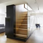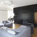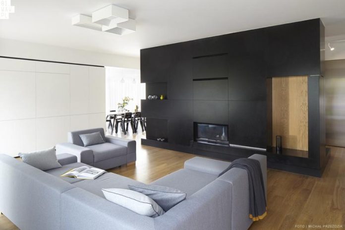 Całość została podzielona na dwie strefy – dzienną, która znajduje się na parterze oraz nocną, zlokalizowaną na piętrze. W części dziennej znajduje się salon z jadalnią, kuchnia, spiżarnia, toaleta oraz gabinet. Centralnym punktem zarówno salonu, jak i całej strefy dziennej jest czarna, bazaltowa bryła, w której zaprojektowany został między innymi kominek. To właśnie wokół niej skupiają się pozostałe pomieszczenia. Od strony kuchni bryła zmienia się w drewnianą kostkę z przeszkleniami, w której mieszczą się schody. Uwagę przykuwa jasna, drewniana podłoga w salonie oraz białe panele z płyty mdf, którymi wyłożono ściany.