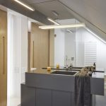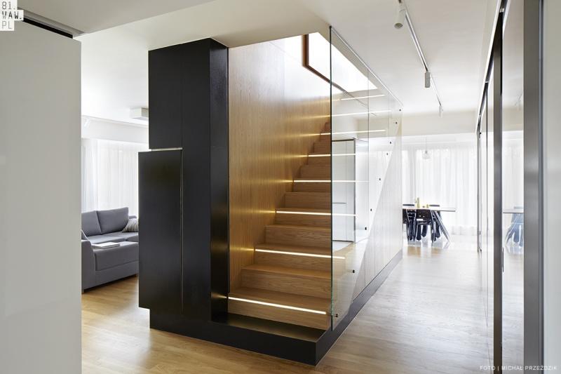 W górnej części zlokalizowano przestronny i długi hol, którego aranżacja była bardzo dużym wyzwaniem oraz pokoje dla dzieci, łazienkę i główną sypialnię z oddzielną łazienką. Efekt optycznego powiększenia przestrzeni uzyskano poprzez wybór jasnej, kamiennej podłogi. Drewniana zabudowa ścian pozwoliła natomiast wydłużyć pomieszczenie. Ledowe oświetlenie w podwieszanym i napinanym suficie typu barrisol rozjaśnia całość. Dodatkowo zastosowano również delikatną, szklaną balustradę oraz duże przesuwne drzwi „wbudowane” w zabudowę ścienną.