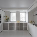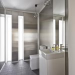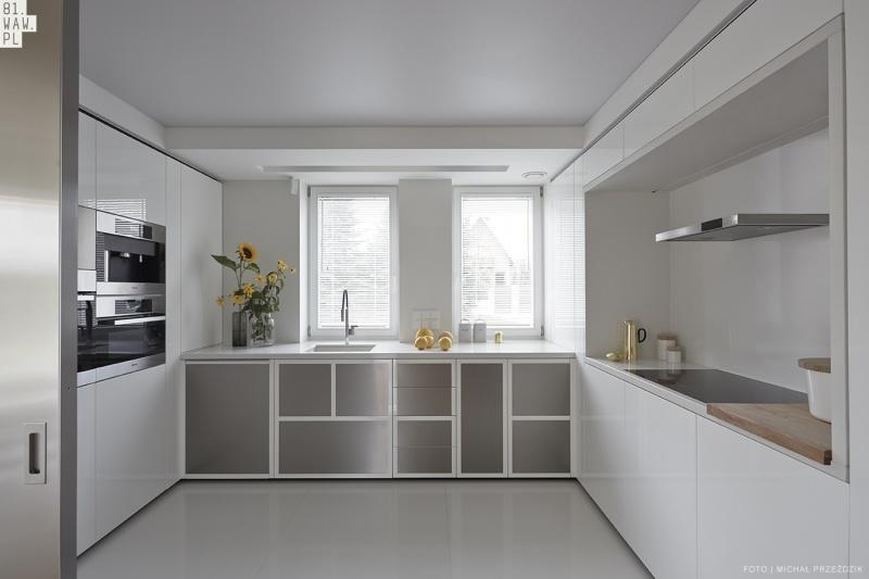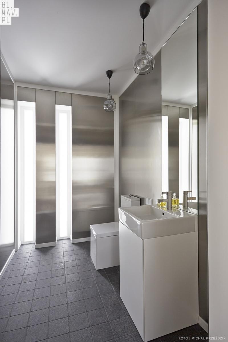 Surowy charakter uzyskano także poprzez zastosowanie szczotkowanej blachy. Wykorzystano ją nie tylko do obicia drzwi wszystkich pomieszczeń, ale także poprzez umieszczenie na ścianach stała się głównym elementem łazienki dla gości. W połączeniu z białą armaturą i szarą podłogą prezentuje się elegancko i zarazem industrialnie. Blacha została wykorzystana również w kuchni, gdzie ułożono ją na białych frontach szafek. Dzięki temu powstała praktyczna, ale i bardzo nowoczesna przestrzeń.