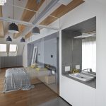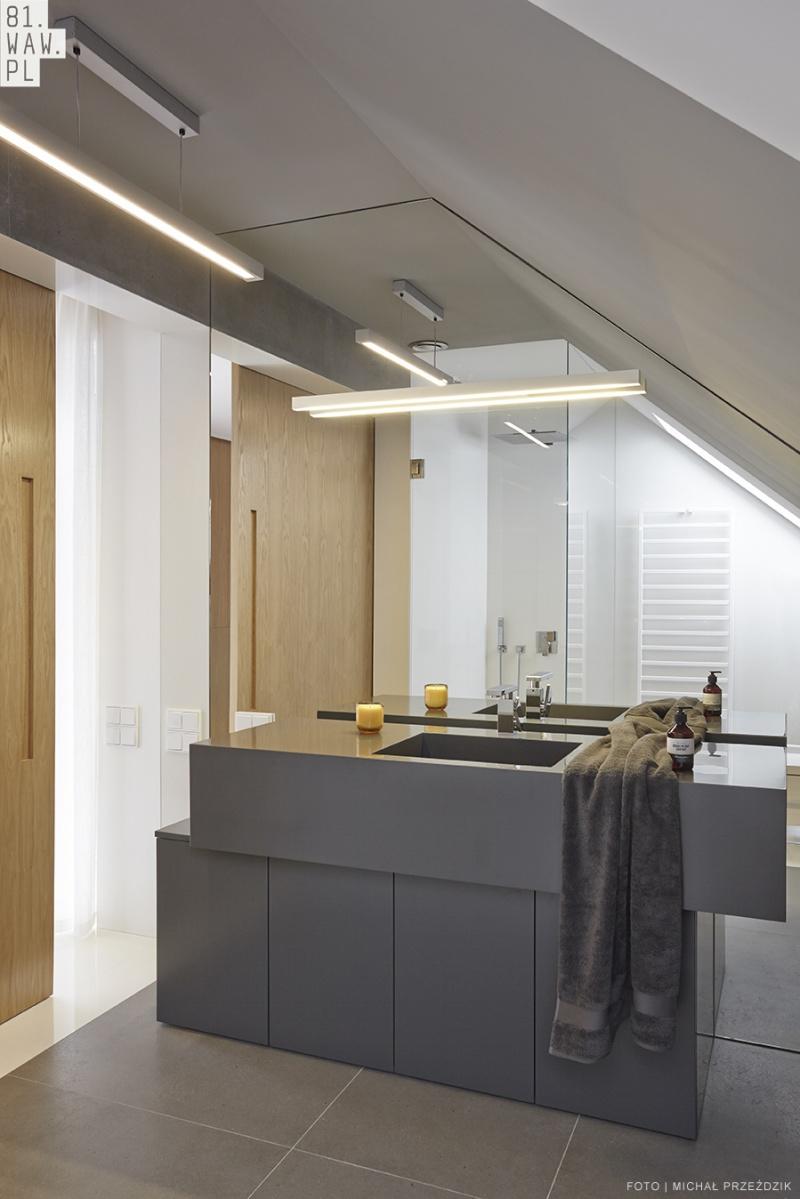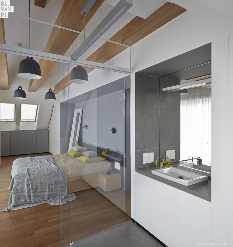 Warto zwrócić uwagę na główną sypialnię, połączoną z przeszkloną łazienką i garderobą. Zastosowanie przeszklenia pozwala stworzyć wrażenie otwartej przestrzeni. Ponadto, w sypialni znalazły się duże lampy techniczne. Oprócz szarej zabudowy i ściany za łóżkiem również w odcieniach szarości, tu także znalazło się miejsce dla drewna. Jasna drewniana podłoga, łóżko oraz elementy konstrukcyjne dachu zdecydowanie ociepliły wnętrze – zaznacza Anna Paszkowska-Grudziąż.