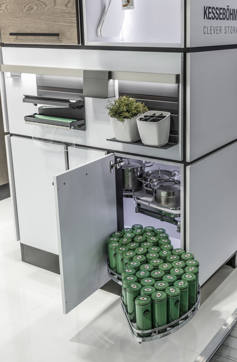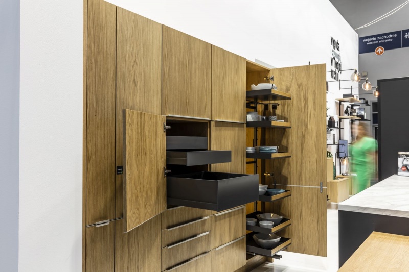 Jak uzyskać jeszcze więcej potrzebnej przestrzeni w szafce? Doskonałe rozwiązanie stanowi kolejna zaprezentowana premiera – TANDEM SIDE, czyli oryginalny pomysł na zagospodarowanie drzwi szafki. System umożliwia wykorzystanie dodatkowej powierzchni przechowywania, jaka znajduje się na drzwiczkach. Co więcej, może być dopasowany do wielkości ich powierzchni. Zastosowanie TANDEM SIDE pozwala także na zmianę konfiguracji półek w zależności od potrzeb. Uczestnicy targów poznali również szuflady marki Grass, łączące w sobie wysoką jakość i nieszablonowy design w bardzo modnym kolorze antracytu.