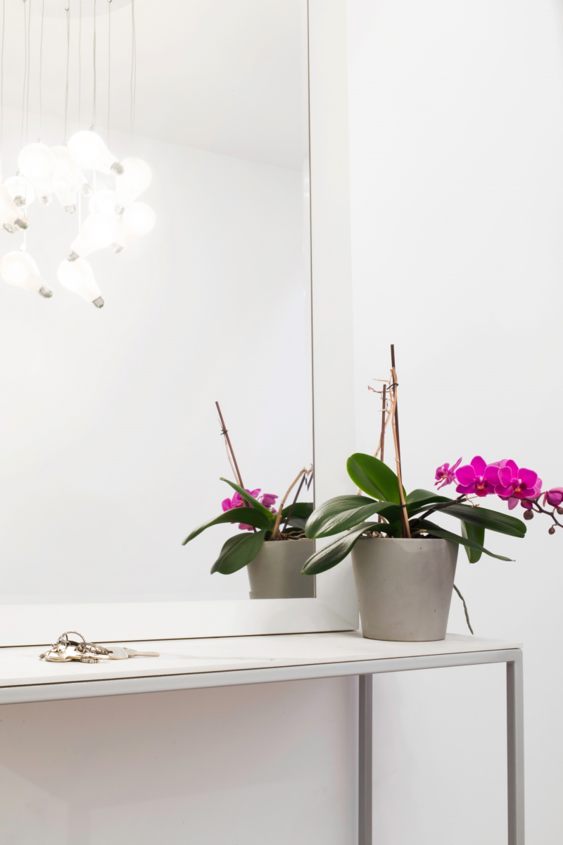 Białe ściany stanowiły doskonałe tło do wszelkich aranżacji. W korytarzu znalazła się stylowa konsolka. To bardzo elegancki i praktyczny mebel, a jego ażurowa konstrukcja sprawia, że nie przytłacza pomieszczenia. W tej realizacji postawiono na konsolę z metalową ramą i blatami ze spieków kwarcowych. Połączenie tych dwóch materiałów gwarantuje trwałość i niebanalny wygląd na lata. Dekoratorka zadbała także o ciekawe oświetlenie korytarza. Wisząca lampa składa się z metalowego, chromowanego mocowania i aż 13 ozdobnych, szklanych żarówek, umieszczonych w ciekawy sposób na cienkich kablach. Żarówki LED gwarantują światło o mlecznej barwie. Ta lampa to połączenie funkcjonalności z ciekawym wzornictwem, a przy tym i duża oszczędność. Całość uzupełnia praktyczny i niebanalny biały wieszak stojący z drewna kauczukowego. Dzięki jego solidnej konstrukcji i aż trzem nogom wszyscy domownicy i goście mogą bez obaw wieszać swoje kurtki i parasole.