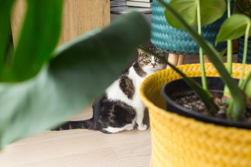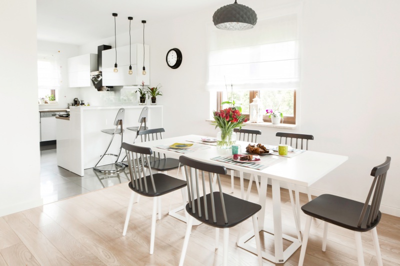 W jadalni do dużego białego stołu, dopasowano bukowe krzesła patyczaki na białych nogach z czarno-szarym siedziskiem i oparciem. Znalazły się w niej też subtelne dodatki, takie jak kolorowe ceramiczne doniczki na metalowych stojakach, biała latarenka czy szklany duży słój – idealny jako wazon na kwiaty. Dopełnieniem całości jest niebanalna lampa metalowa w kolorze szarosrebrnym.