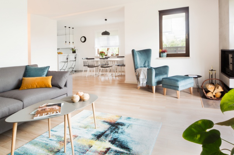 Sporym wyzwaniem okazała się aranżacja salonu ze strefami i otwartej kuchni z jadalnią. – Ponieważ salon jest sercem każdego domu, a domownikom zależało na dużej kanapie, postawiłam na wygodny i funkcjonalny narożnik, w neutralnym, szarym kolorze – mówi Kinga Świątek-Wolna. Tym mieszkańcom, którzy lubią oddawać się wieczornej lekturze szczególnie przypadła do gustu czarna lampa podłogowa wykonana z metalu i drewna. Przy sofie nie mogło zabraknąć stolików kawowych również w szarym kolorze. Ich bukowe nogi pasują do drewnianej podłogi i komody pod telewizorem, którą wyróżniają kolorowe fronty. W salonie zawisła duża lampa z przydymionego szkła. Wnętrze utrzymane jest w stylistyce skandynawskiej. – Nie byłabym jednak sobą, gdybym nie zaproponowała kolorowych dodatków dla przełamania szarości i północnoeuropejskich klimatów. Postawiłam na ręcznie malowany abstrakcyjny obraz, tekstylia i plecione donice na drewnianych nogach w niezwykle modnych odcieniach turkusu i żółci. Całość wprost idealnie koresponduje z majestatyczną sofą. W części salonu zorganizowaliśmy strefę chillout przy kominku z wygodnym uszakiem z podnóżkiem – również w kolorze turkusowym – dodaje.