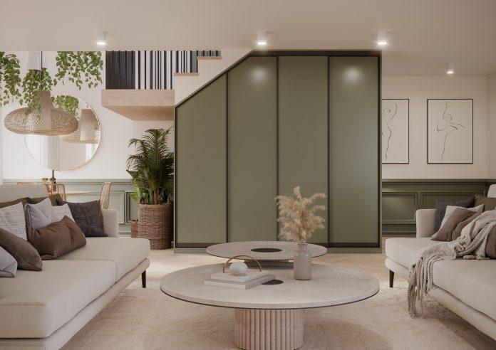• Zintegrowane fronty – drzwi przesuwne lub uchylne mogą być wykonane w kolorze ściany, z lustrem lub dekoracyjnym wykończeniem, co pozwala optycznie powiększyć przestrzeń.