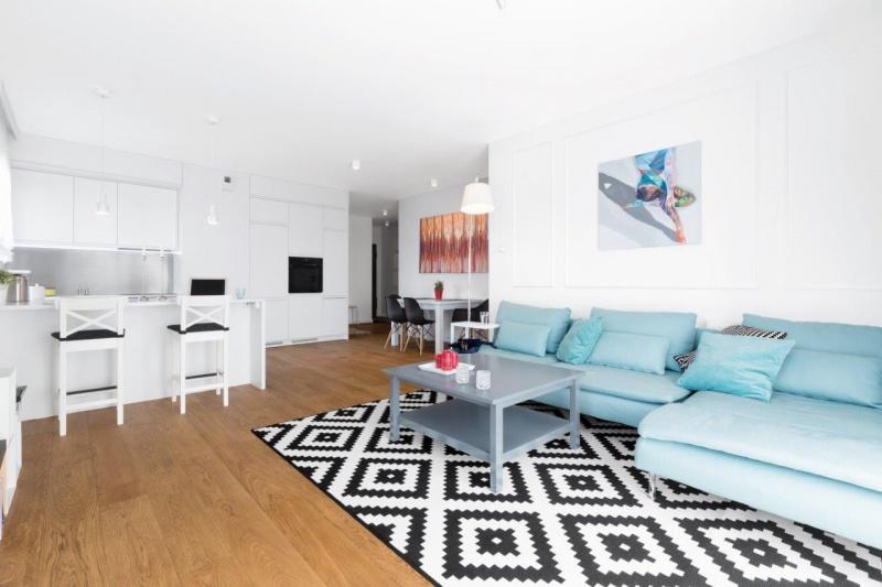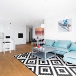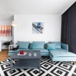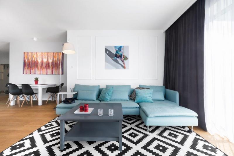 Miejscem reprezentacyjnym jest salon. To w nim właściciele spędzają najwięcej czasu, tutaj też przyjmują gości. Błękitna kanapa jest jego głównym elementem, a nawet można pokusić się o stwierdzenie, że jest ona centrum całego lokalu. Idealnie wpisuje się w chłodne i oszczędne otoczenie, a jednocześnie nadaje mu przytulność. Dywan w skandynawski wzór nakreśla granice miejsca służącego do relaksu przy telewizji lub książce, choć można tu także spędzić czas, pracując przy laptopie, o czym przypomina niewielki stolik pomocniczy. Na białej ścianie wyeksponowano obraz, który ozdabia przestrzeń nad kanapą i uzupełnia się kolorystycznie z meblem.