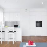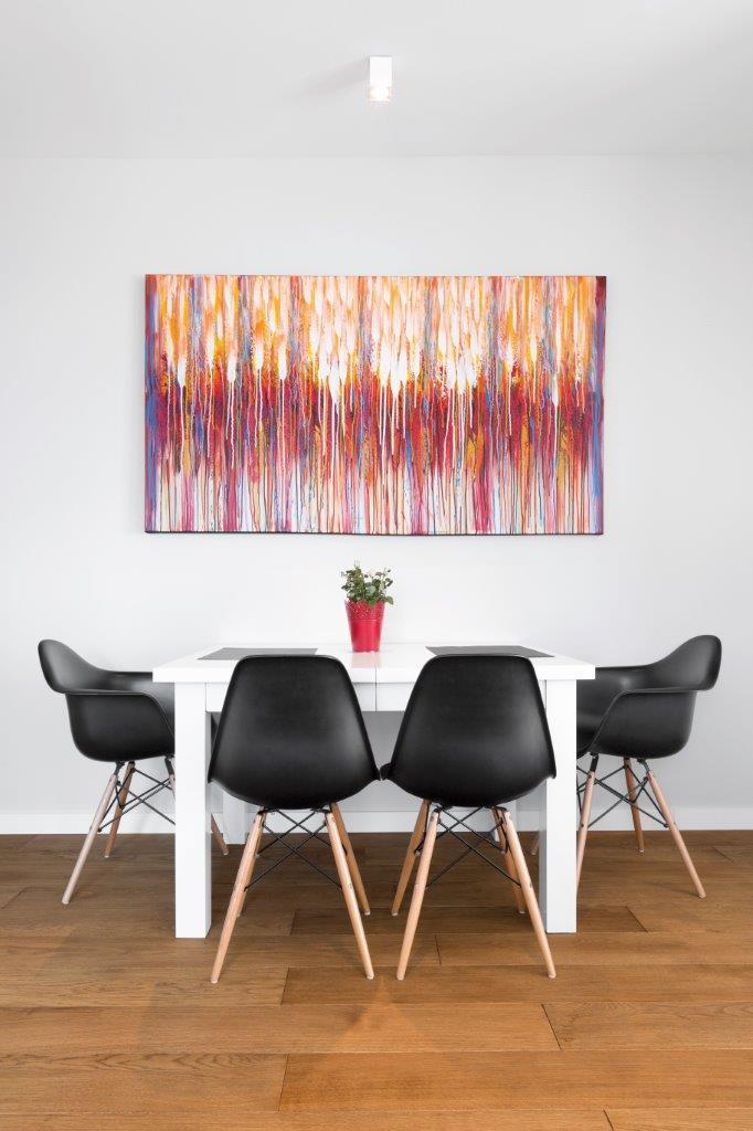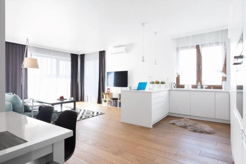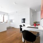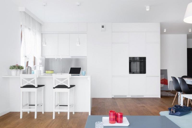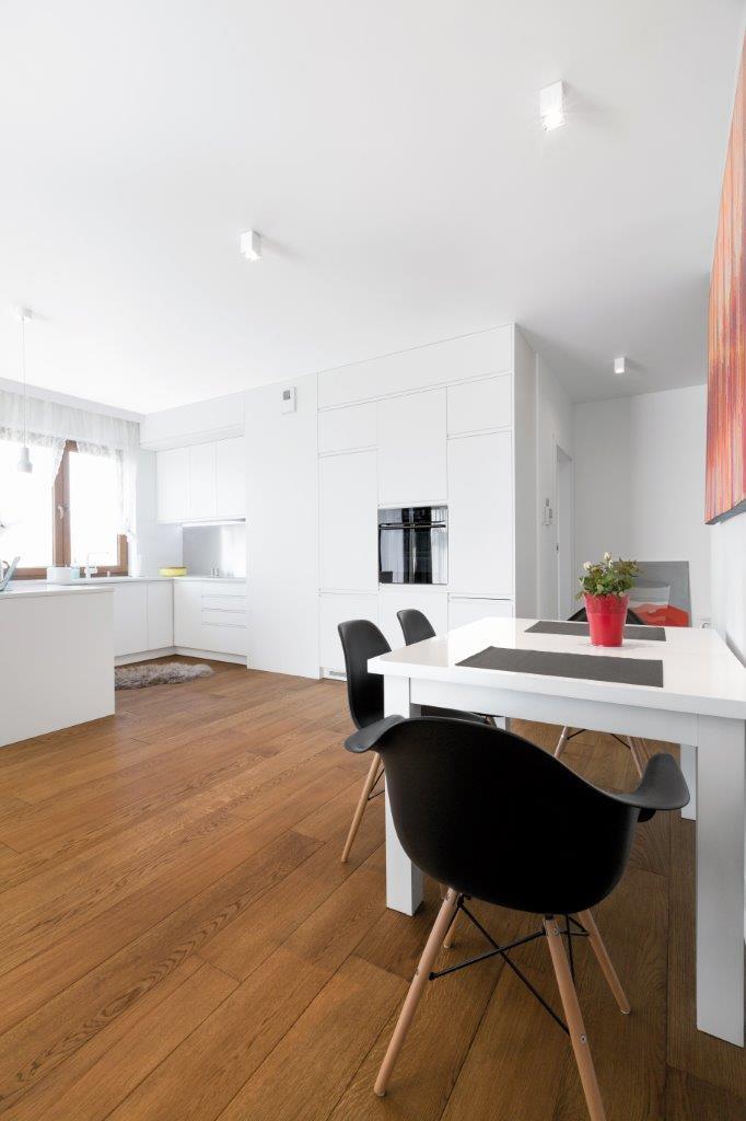 Ponadsiedemdziesięciometrowe mieszkanie w centrum Krakowa jest idealną kwaterą dla młodych właścicieli, studentów ekonomii. Dzięki takiej lokalizacji mają oni blisko zarówno na uczelnię, jak i rynek czy Wisłę, co jest dużą zaletą przy intensywnym trybie życia, który prowadzą. Nie mają czasu na nudę – nauka, sport i interesujące spotkania wypełniają im większość czasu. Oboje jako umysły ścisłe lubią uporządkowanie, praktyczność – i takie właśnie jest miejsce, w którym żyją. Podczas wyboru mieszkania oprócz jego położenia ważna była dla nich jak największa przestrzeń, którą da się uzyskać w pomieszczeniach. Widać to na zrealizowanej aranżacji, której wszystkie elementy podporządkowują się założeniu, jakim było uzyskanie obszernego wnętrza. Głównym elementem wprowadzającym do niego przestronność i świeżość jest dominująca wszędzie biel tworząca tło dla prostego wystroju. Na pytanie, gdzie szukali inspiracji do urządzenia mieszkania, pani Ewelina odpowiada, że aranżacja jest głównie własnym pomysłem, a we wprowadzeniu go w życie pomogła zaprzyjaźniona pracownia projektowa.