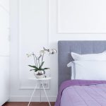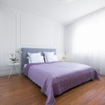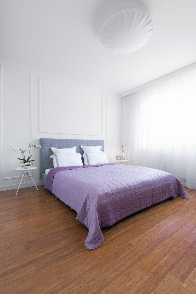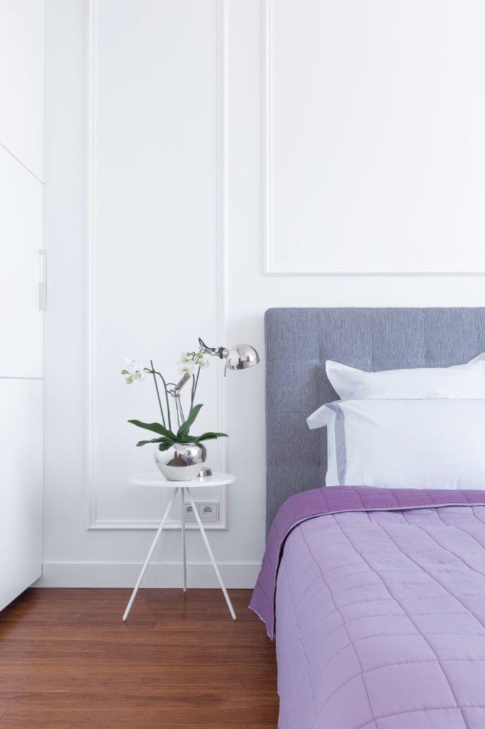 W sypialni, podobnie jak w salonie, kolorem przewodnim jest ulubiony fiolet. Znalazł się on zarówno na narzucie, jak i zasłonach. Z uwagi na zamiłowanie pani Małgorzaty do sztukaterii nie mogło zabraknąć jej w klimatycznej sypialni. Dodaje ona wnętrzu charakteru, ale i elegancji oraz nuty romantyzmu. Delikatne stoliki nocne zdobią srebrne dodatki, które również potęgują efekt eleganckiego wnętrza. Na miejscu tradycyjnej toaletki stanęła subtelna konsola, przy której można wygodnie zasiąść przed komputerem. Całość aranżacji, z uwagi na dbałość o każdy detal, sprawia, że sypialnia idealnie spełnia swoją rolę jest miejscem relaksu i wieczornego wyciszenia. Podłogę w sypialni, podobnie jak w reszcie mieszkania, zdobi deska bambusowa w kolorze karmelu. Dość ciemny, ale ciepły odcień dodaje wnętrzom przytulności.