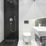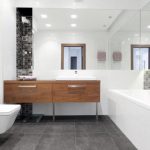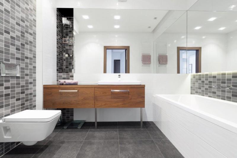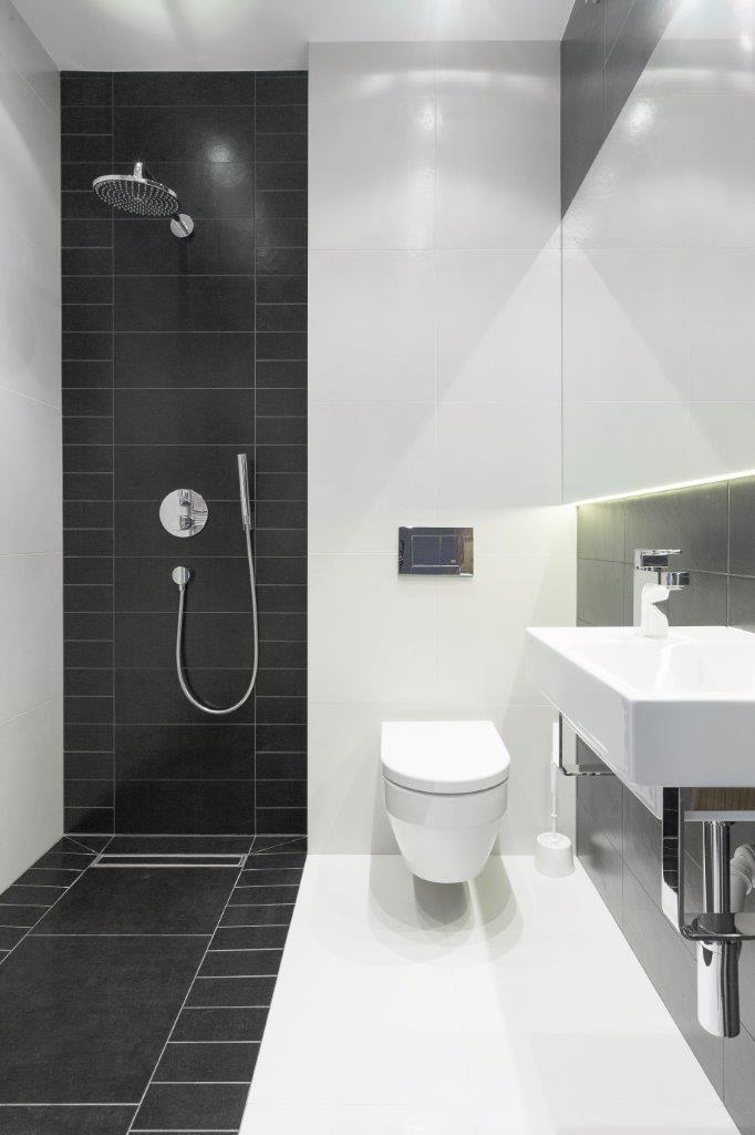 W mieszkaniu znajdują się dwie łazienki. Większa wyposażona jest w wygodną wannę, w mniejszej swoje miejsce znalazł prysznic. Jak przyznaje pani Małgorzata, w tej drugiej nadal brakuje szklanego parawanu. Mimo że mieszkanie urządzane było dość długo 3 lata to za każdym razem, kiedy temat wracał, okazywało się, że pojawiły się inne wydatki. Chociaż do braku parawanu wszyscy się już przyzwyczaili, jego zakup nadal jest w planach. Z uwagi na niewielką przestrzeń, brak przeszklenia jest nieco niepraktyczny. Oba pomieszczenia zachowane zostały w spójnej kolorystyce bieli, szarości i czerni, a duże lustra powiększają je optycznie.