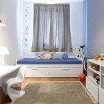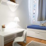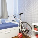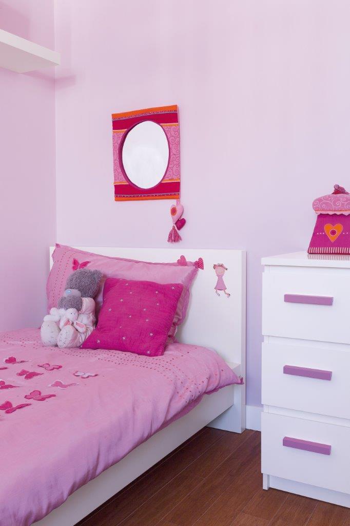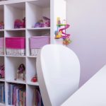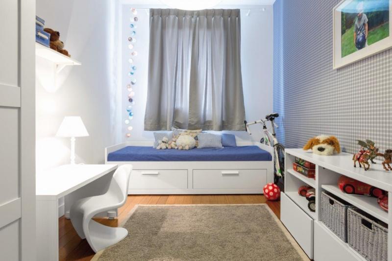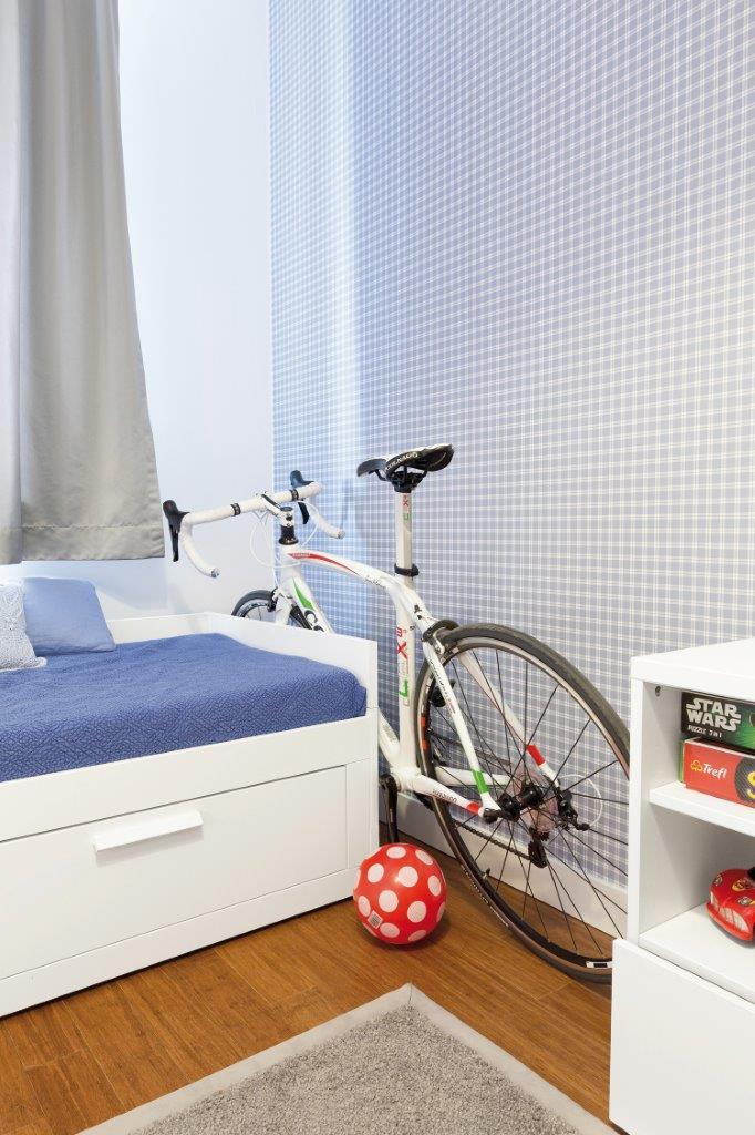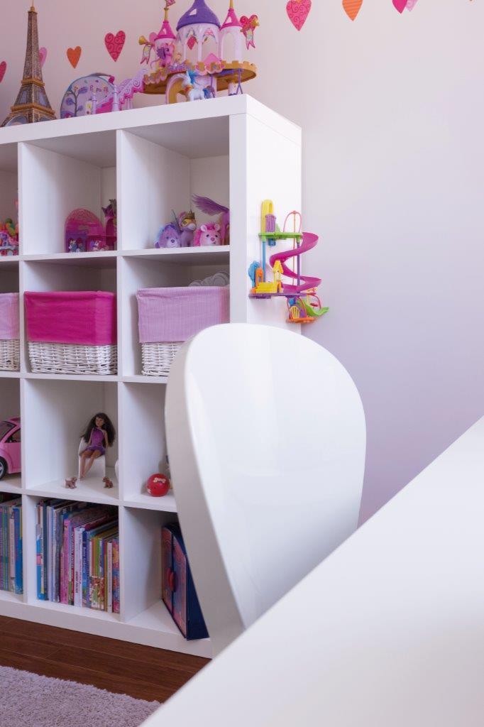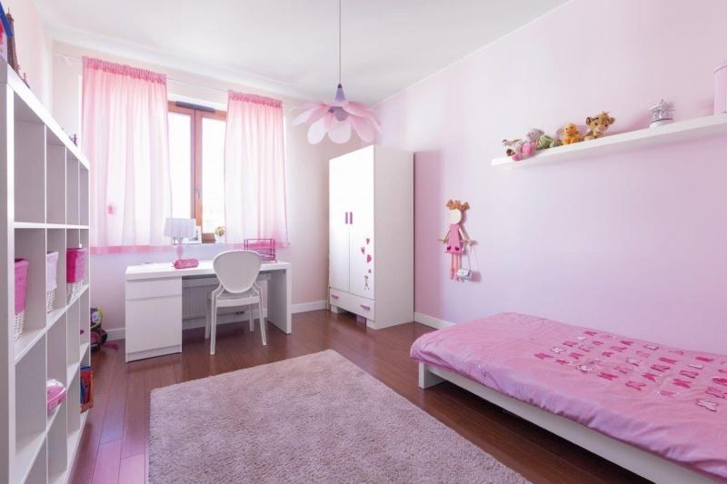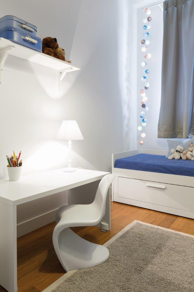 Sypialnie różowa i niebieska to królestwa dzieci. Ośmioletnia Natalia kocha śpiewać i tańczyć, stąd sporo wolnej przestrzeni w centralnej części pomieszczenia. Funkcję praktyczną spełniają obszerna szafa i otwarty regał, bez problemu mieszczący bibeloty małej księżniczki. Pięcioletni Szymon czas wolny uwielbia spędzać na wznoszeniu kolejnych wież i budowli z klocków, dlatego i tutaj środek pokoju pozostał niezagospodarowany. W obu pokojach oprócz strefy do zabawy nie zabrakło kącików do nauki. Wygodne duże biurka uzupełniają modne, wygodne i funkcjonalne krzesła.