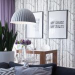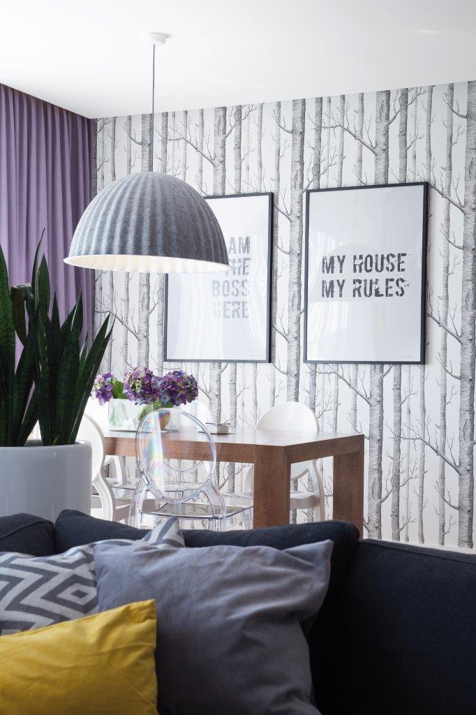 Salon usytuowany jest od strony północno-zachodniej, co wieczorami sprzyja pięknym widokom zachodzącego słońca. W części kuchennej na jednej ze ścian pojawiła się tapeta. Jak przyznaje pani Małgorzata, był to świetny wybór, tym bardziej że w strefie blatu zabezpieczono ją szklaną taflą, co sprawia, że zachowanie czystości nie jest dużym problemem, a wszelkie zabrudzenia stają się niemal niewidoczne. Światło odgrywa istotną rolę we wnętrzu i jest podzielone na główne rozjaśniające cały pokój oraz kilka punktów świetlnych, które mają za zadanie oświetlać blat czy stół w jadalni. Światło naturalne zagląda do salonu po południu, co jest pozytywnie odbierane głównie jesienią i zimą.