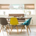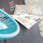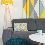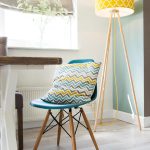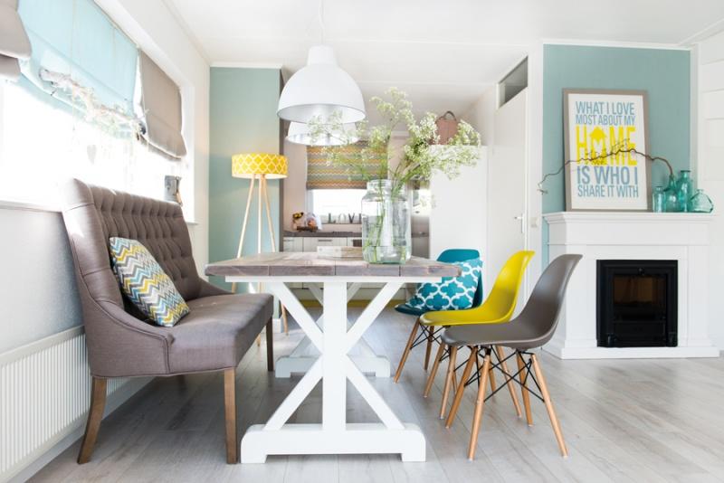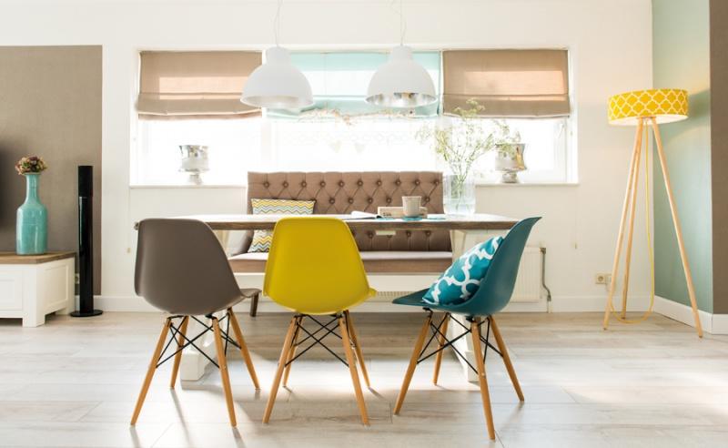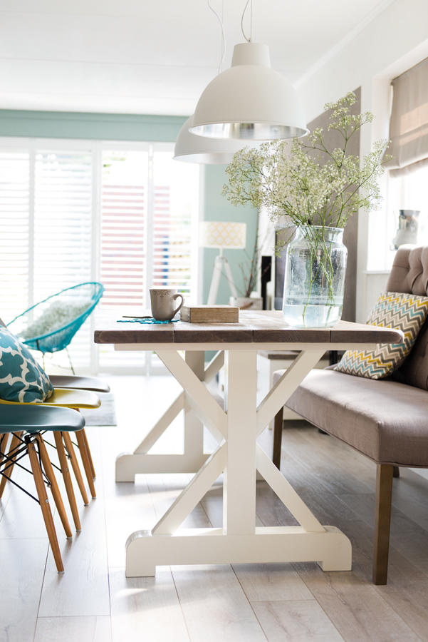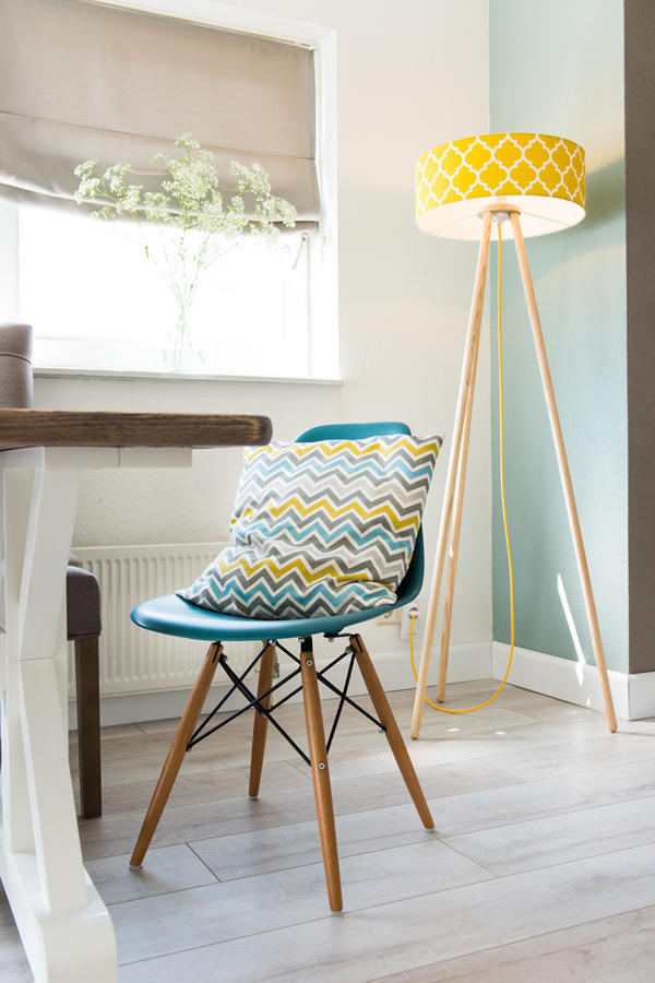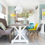 Centralne miejsce zajmuje solidny stół kojarzący się z rustykalnymi aranżacjami. Koniecznie musiał mieć drewniany blat – i taki właśnie jest. Ponieważ pani Maryla zwraca uwagę też na aspekt praktyczny, blat jest lakierowany, co zapobiega jego uszkodzeniom i zabrudzeniom. Koloru dodają trzy krzesła Eames oraz uszyte przez panią domu poduszki – oczywiście w geometryczne wzory. Jako kontrast do krzeseł pojawiła się kanapa, która przełamuje konwencję i wprowadza jeszcze więcej wygody w to miejsce.