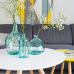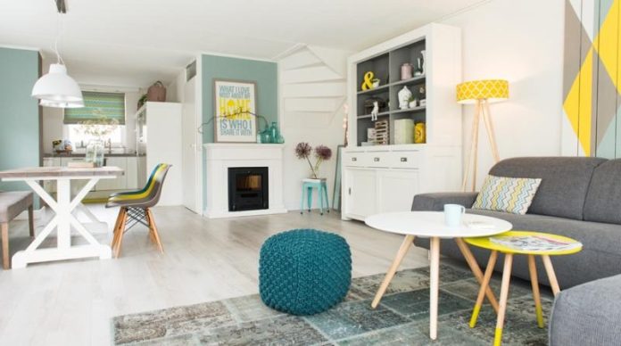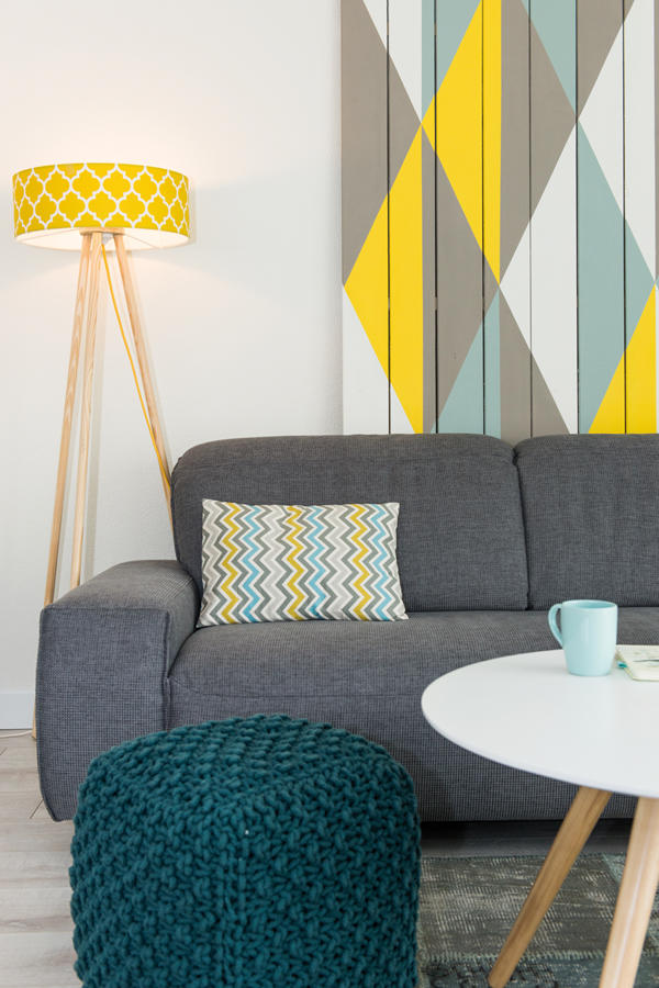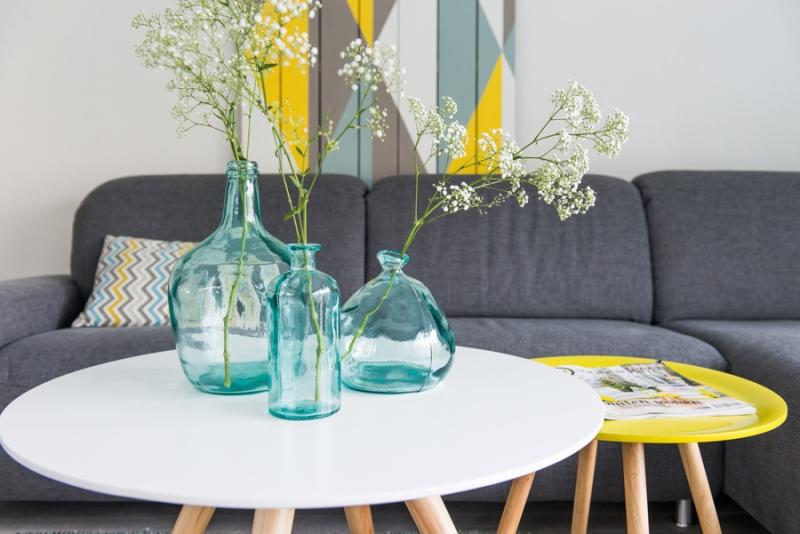 Pani Maryli szczególnie bliski jest styl skandynawski, co można łatwo zauważyć. Obecny wygląd pomieszczeń został dokładnie przemyślany i dopracowany w każdym szczególe, a jego realizacja musiała być perfekcyjna. Jednak pierwotne plany kolorystyczne zostały mocno zmienione m.in. przez pomyłkę dostawcy, który zamiast jednego białego krzesła wysłał żółte. W tym czasie pani Maryli spodobał się żółty stolik kawowy i uznała, że wprowadzi ten kolor do wnętrza. Najważniejsza w salonie, a właściwie w całym domu, jest sofa. Musiała być idealna: wygodna, szeroka, z regulowanymi zagłówkami. Na niej mieszkańcy spędzają codziennie parę godzin, więc nie uznawali żadnych zamienników. Poszukiwania trwały około roku, aż ostatecznie mebel został wykonany na zamówienie przez austriacką firmę i zajął miejsce przy tureckim dywanie.