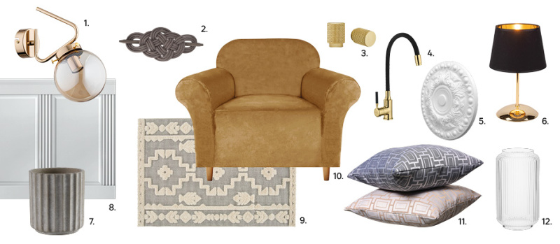 Na zdjęciu: 1. kinkiet Barsum złoty 175,00 zł, 2. Upinacz do zasłon 24,99 zł, 3. Gałka meblowa Axcel 18,99 zł, 4. Bateria kuchenna z elastyczną wylewką 259,00 zł, 5. Rozeta sufitowa śr. 48 cm 49,99 zł, 6. Lampa stołowa Glory 149,00 zł, 7. Osłonka doniczki cementowa 8,29 zł, 8. Boazeria angielska MDF 99,99 zł, 9. Dywan zewnętrzny Oslo 269,00 zł, 10. Pokrowiec na fotel Smart Protect Velvet Gold 99,50 zł, 11. Poduszka Zelda Pecan 39,90 zł, 12. Wazon szklany ryflowany 16,99 zł.