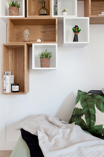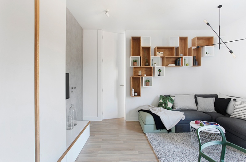W salonie postawiono na drewno. Ciekawym elementem ozdobnym jest ściana z drewnianych i białych kubików. Zostały one wykonane według projektu studioLOKO na zamówienie u zaprzyjaźnionego stolarza. Początkowo w salonie miał być wiszący regał, ale żeby nie był zbyt przytłaczający – zdecydowano się na kubiki, dzięki czemu coś ciekawego dzieje się na ścianie i nie jest to np. galeria plakatów, czy zdjęć. We wnętrzu widoczny jest również motyw roślinny.