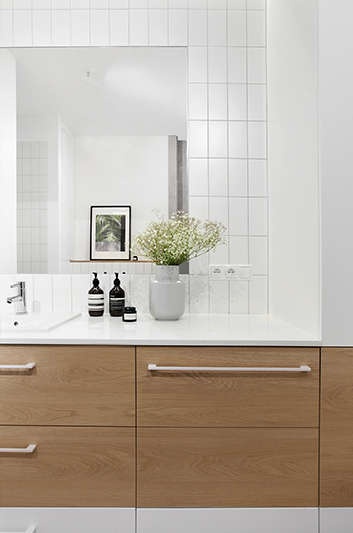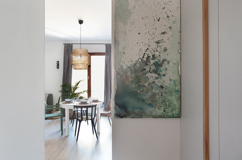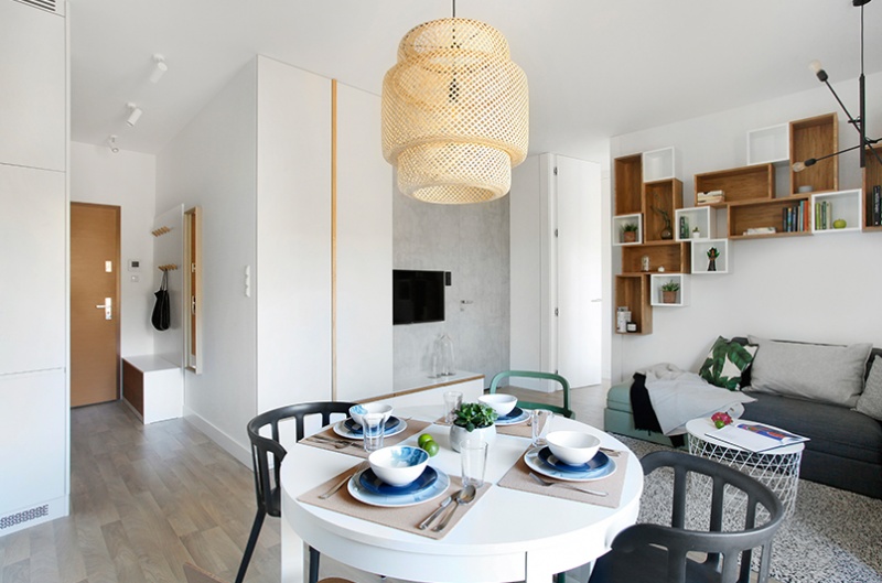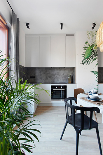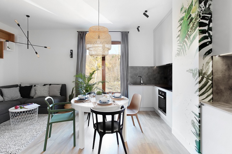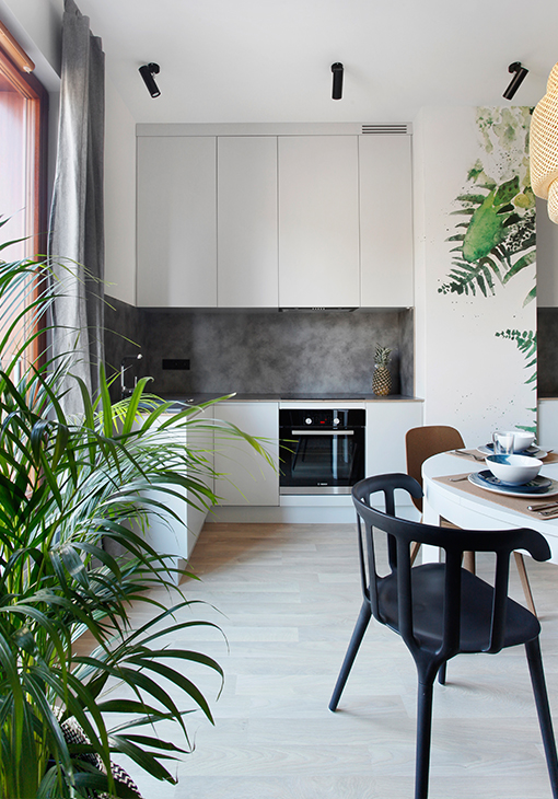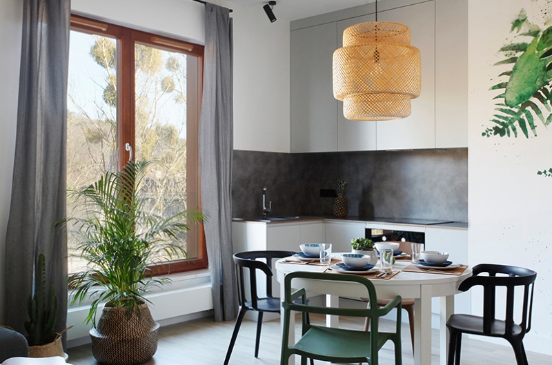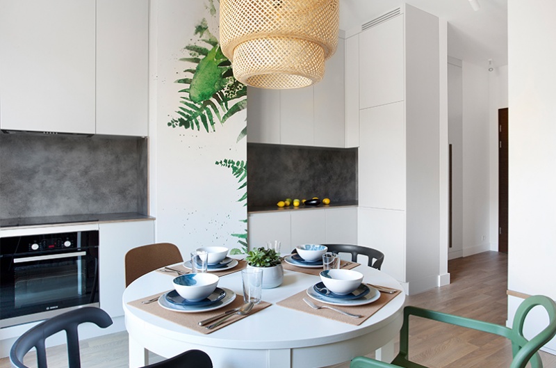 Wnętrze miało być praktyczne, wykonane z wytrzymałych materiałów. Według projektantek wyzwanie stanowił nietypowy układ mieszkania. Powierzchnia mieszkania to ok 50 m2, na którą składa się korytarz, salon z aneksem, łazienka i sypialnia. Warto tutaj dodać, że salon jest połączony z kuchnią. Mimo ograniczonej powierzchni udało się wydzielić jeszcze część jadalnianą. Jak podkreślają same projektantki – zaprojektowanie takiej powierzchni to przede wszystkim duży nacisk na spójność wizualną i równowaga między pomieszczeniami, czy też strefami. Jednym z trików jest użycie tego samego koloru w części wypoczynkowej, co w kuchni i jadalni.