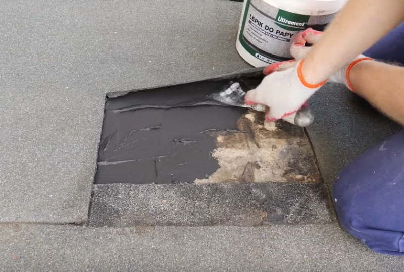 Z kolei chcąc podkleić starą papę lub zamocować nową, w przypadku gdy stara np. uległa sfałdowaniu, sięgamy po klej w postaci lepików na zimno, którymi przyklejamy nowy fragment materiału. Lepiki na zimno to środki jedno lub dwukomponentowe odpowiednio używane w zależności od stopnia nachylenia naprawianego dachu. Są stosunkowo gęste (nie spływają z dachu) przez co ułatwiają prace naprawcze.