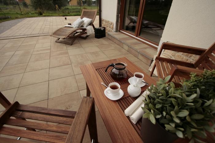 Łącznikiem między domem i ogrodem jest taras. Jednocześnie jest to najlepszy punkt, z którego można obserwować ogród, każdego dnia na nowo zachwycając się pięknem natury. Równa i stabilna powierzchnia z płyt stanowi pewne podparcie dla krzeseł i stołu oraz dla wygodnego fotela. Taras to idealne miejsce do wypicia porannej kawy i rozmyślań. Stąd też jest najlepszy widok na zielone bogactwo natury, które koi nerwy i pozwala odpocząć oczom zmęczonym po całodziennej pracy. Matowe płyty tarasowe lekko nagrzane słońcem zapraszają do wykonania kilku prostych ćwiczeń rozciągających. Jeszcze parę głębokich wdechów i z powodzeniem można stawić czoło całemu światu.