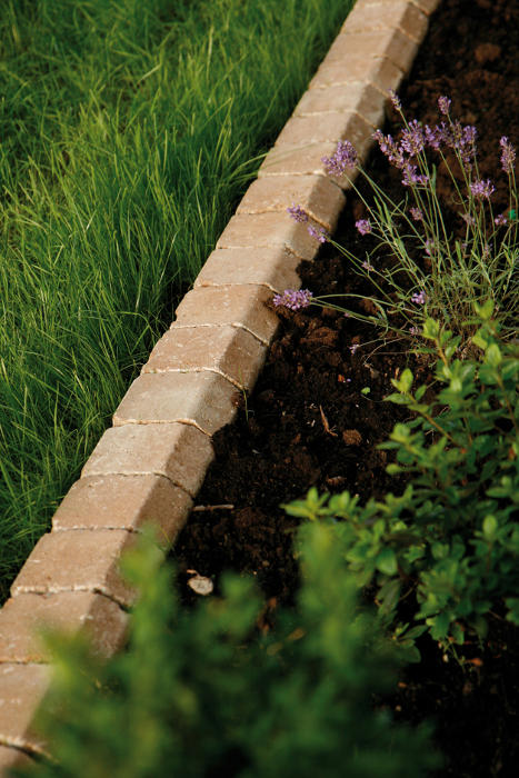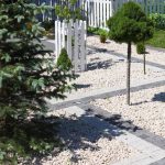 Fot. 6, 7 – Piękno natury wymaga odpowiedniej oprawy. Umiar, mały detal wpływają na całą kompozycję. Od lewej Kravento Basso (Libet Decco) oddziela trawnik od pasa ziemi z kwiatami i krzewami. Obok ozdobne kamyki (marmurowy grys w kolorze crema marmo – Libet Patio) wysypane wokół rabat ograniczą porost chwastów i zapobiegną tworzeniu się kałuż. Granice kwartałów wyznaczone kostką Piccola, bianco carrara i nero (Libet Decco)
