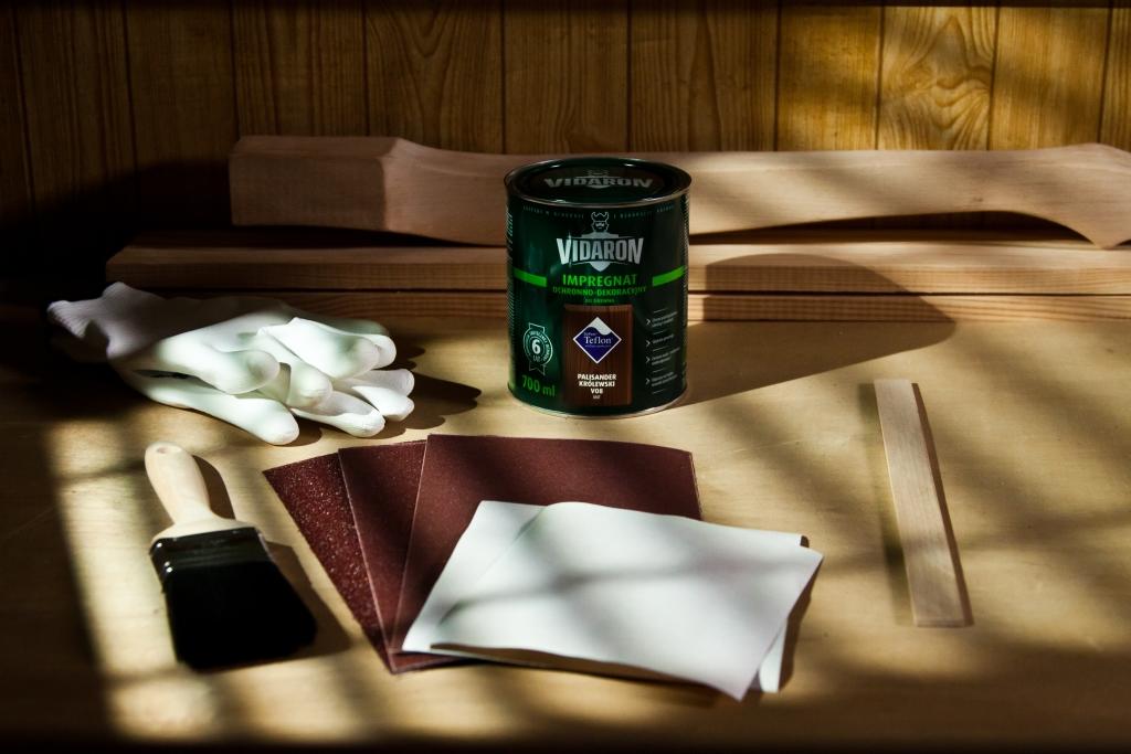 Na tak przygotowanej powierzchni drewna rozpoczynamy impregnację preparatu. Do impregnacji można wykorzystać Impregnat Ochronno-Dekoracyjny VIDARON z dodatkiem Teflon® surface protector. Zabezpiecza on drewno na zewnątrz i od wewnątrz, jednocześnie nadając drewnianym elementom eleganckie matowe wykończenie i podkreślając usłojenie drewna. Drewniane elementy, które będą narażone na bezpośrednie działanie warunków atmosferycznych najlepiej zabezpieczyć wcześniej warstwą bezbarwnego Impregnatu Ochronno-Dekoracyjnego VIDARON. Impregnat bezbarwny pozbawiony jest pigmentów, dzięki temu głęboko wnika w drewno i zapewnia pełną ochronę przed zagrożeniami biologicznymi – grzyby, owady, pleśń.