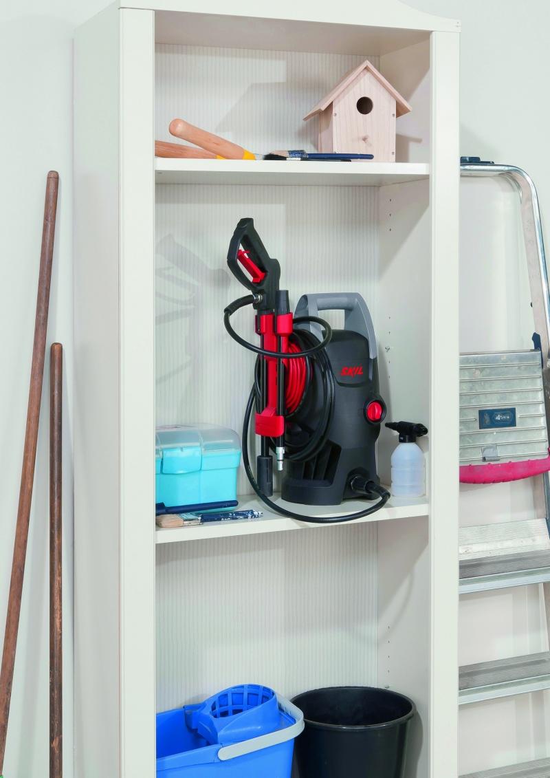 Myjka SKIL ma też kompaktową konstrukcję i przemyślany sposób przechowywania akcesoriów. Urządzenie jest częścią systemu „Easy Storage” opracowanego przez markę SKIL. Oznacza to, że wyjątkowo łatwo je przechować, nawet na niewielkiej powierzchni – dzięki specjalnemu uchwytowi znajdującemu się w zestawie, myjkę możemy łatwo zamontować w dostępnej przestrzeni.