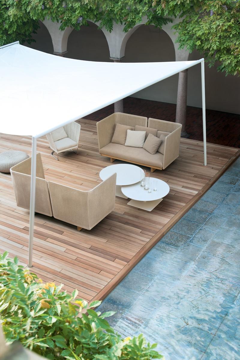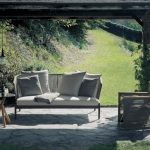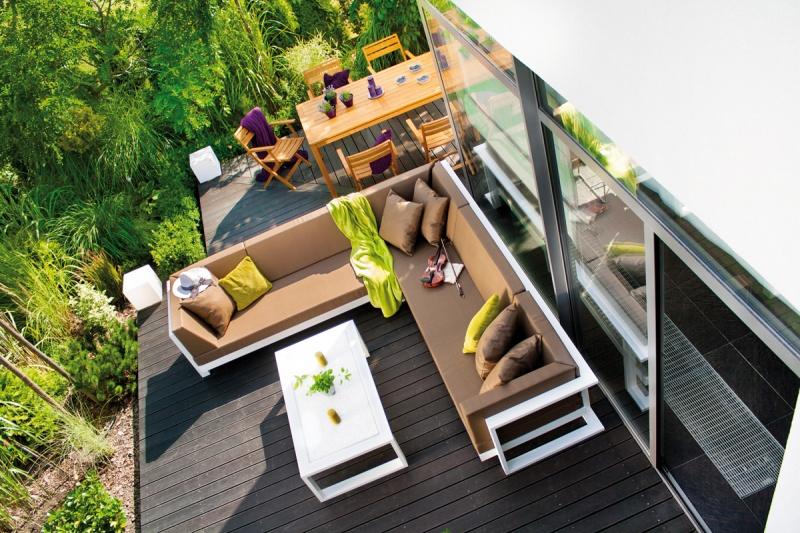 Taras stwarza więcej aranżacyjnych możliwości, szczególnie na parterze – wtedy wizualnie może „przedłużyć‛‛ go dalsza część ogrodu. Jeśli mamy na tyle miejsca, warto rozważyć wybór wygodnej kanapy lub leżanki. Trikiem przy aranżacji mniejszej powierzchni jest postawienie ażurowych, kutych mebli i stolika ze szklanym blatem. Optycznie nie zabiorą one dużo miejsca. Jeśli chcemy otoczyć się roślinnością, zamontujmy na ścianie półki, na których ustawimy doniczki z kwiatami.