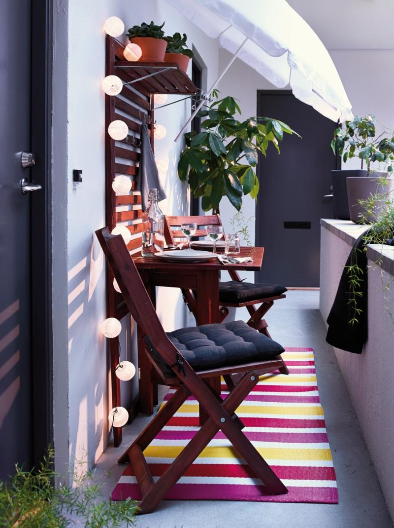 Jeśli mamy do dyspozycji balkon w bloku, powinniśmy zaaranżować go tak, aby połączyć funkcję wypoczynkową z praktyczną (np. zostawić miejsce na rozłożenie suszarki). Chcąc otoczyć się zielenią, która nie zajmie wiele powierzchni, postawmy na rośliny w skrzynkach zawieszone na balustradzie. Można też zasadzić kwiaty pnące, którym umożliwimy rośnięcie po specjalnej kratce, dzięki czemu zyskamy „zieloną ścianę”. Mądrym wyborem będą składane krzesła, a ich wygląd ocieplą i urozmaicą poduszki.