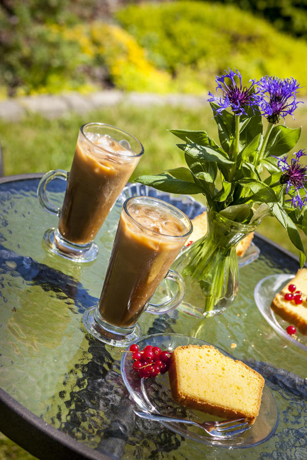 Kiedy na zewnątrz jest bardzo gorąco nic tak skutecznie nie doda nam energii, jak kawa latte na zimno. Zatopione w napoju kostki lodu znakomicie ochłodzą ciało, a specjalna, godna tego wyśmienitego trunku oprawa podkreśli wyjątkową atmosferę spotkań towarzyskich. Kawa latte najlepiej smakuje w wysokich szklankach o nowoczesnym wzornictwie wyposażonych w wygodny w użyciu uchwyt. Orzeźwiającemu napojowi może towarzyszyć domowe ciasto oraz zebrane w ogrodzie owoce i kwiaty ustawione na szklanym stoliku pośród rozkwitającej roślinności. To najlepszy przepis na odpoczynek w gronie najbliższych.