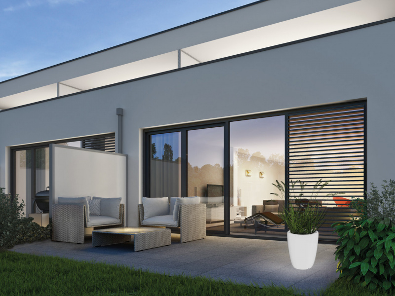 Istotnym elementem jest oświetlenie budynku, pozwalające podkreślić urok architektury i zachować spójność z całością koncepcji. Geometryczne kinkiety ścienne w kształcie prostokąta, jak na przykład SYMMETRY LED, pięknie eksponują walory bryły budynku, jednocześnie zapewniając optymalną widoczność. Można także zdecydować się na oświetlenie punktowe, wybierając oprawy w kształcie prostopadłościanu (BRAVO) lub walca (ALPHA).