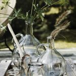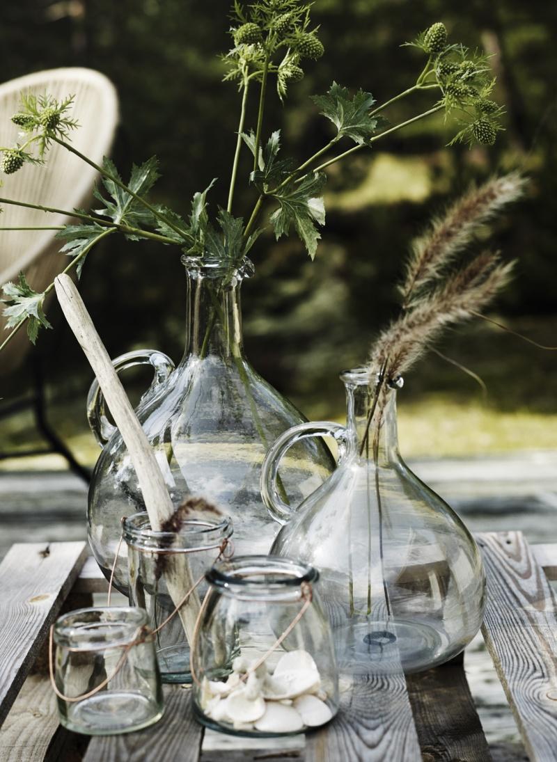 Ogrodową aranżację upiększą szklane wazony, słoje i flakoniki, lecz należy pamiętać, żeby ustawiać je w miejscach, w których się nie przewrócą pod wpływem wiatru.