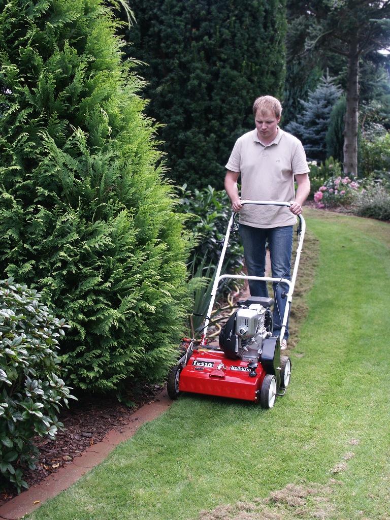 Ten zabieg pielęgnacyjny na trawniku najwygodniej i najsprawniej wykonuje się specjalną maszyną – wertykulatorem. Na trawnikach każdego formatu sprawdza się uniwersalna maszyna TV 510 o szerokości roboczej 45 cm. Wyposażona w niezawodny silnik Honda GX 160 o mocy 4,8KM, zapewnia wysoką wydajność w trybie 1 500 m²/h. Korzystną dla użytkownika zaletą tej maszyny jest niskie zużycie paliwa oraz jego wydłużona żywotność – ten silnik zachowuje ponad 2 000 motogodzin pracy i może być poddany kilku remontom, tzw. szlifom. Po wymianie elementu roboczego na wał aeracyjny może być także stosowany do aeracji trawników.
