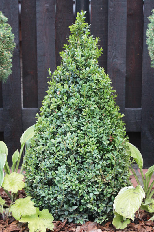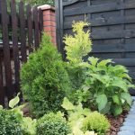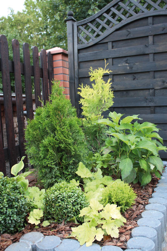 Inspiracją do zaprojektowania ogrodu było nowoczesne wnętrze mieszkania właścicieli, w którym kolorystyka oscyluje w kolorach czerni, czerwieni i fioletu. Podobną tonację chciałam zastosować w przestrzeni ogrodowej. Tu dominantą jest kolor czarny, a dodatkami zieleń, biel i szarości. Chcąc nadać przestrzeni ogrodowej więcej intymności, zaproponowałam ustawienie po obu stronach działki płotów lamelowych, które później zostały pomalowane na kolor głębokiej czerni. Czarne są również betonowe palisady stanowiące front wzniesionej rabaty. Niemalże cały ogród został wyłożony kamiennymi płytami, które są bardzo łatwe w utrzymaniu oraz stanowią interesujący akcent. Płyty z kamienia zostały ułożone również dla wygody właścicieli ogrodu, którzy nie mają zbyt wiele czasu na koszenie trawnika. Chcąc rozjaśnić wnętrze ogrodu, postanowiłam zastosować tu zmienność kolorystyczną w roślinności. Zaprojektowałam strzyżone krzewy iglaste w różnych odcieniach zieleni – od niemalże żółtych po ciemnozielone. W projekcie na rabacie wpisane zostały formowane krzewy: strzyżone kulki cyprysów oraz wysoki bukszpan formowany w spiralę. Niestety z braku takiego materiału roślinnego w lokalnych szkółkach, należało zastąpić owe nasadzenia innymi. Obecnie królują tu: żywotniki zachodnie „Szmaragd” (tzw. Tuje), świerki „Conica” strzyżone w kulki, Cyprysy „Ivonne”, bukszpany, dwie białe hortensje oraz drobne byliny żurawki i funkie.