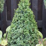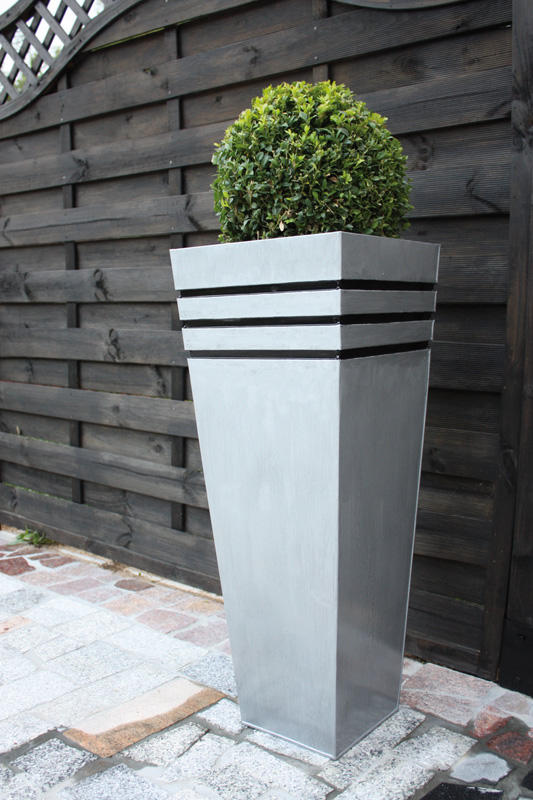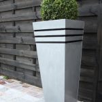 Lamelowy płot jest doskonałym tłem dla trzech nowoczesnych donic, w których zostały posadzone krzewy bukszpanu. Charakterystycznym elementem stylu nowoczesnego w ogrodzie są powtarzające się kompozycje roślinne – tu zastosowanie identycznych donic. Płot stanowi również tło dla pojemników wiszących. Powieszone zostały na nim metalowe donice wypełnione kwitnącymi na biało roślinami jednorocznymi: lobeliami, petuniami, smagliczkami.