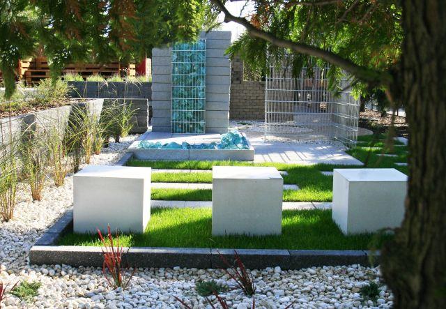 Oszczędność środków wyrazu, ale jednocześnie ich wyrazistość to kolejna cecha ogrodu Zen. Z tego właśnie powodu jego prostą kompozycję zamykają dosyć duże, jasne, wykonane z betonu architektonicznego kubiki. Pozostałą przestrzeń wypełniają drobne otoczaki oraz soczysta zieleń roślin. Swoboda traw została jednak ograniczona ułożonymi poziomo i bezpośrednio na ziemi splitowanymi palisadami. Powstałe w ten sposób krawężniki utrzymują porządek i powstrzymują rośliny przed „ucieczką” z wyznaczonego dla nich miejsca.