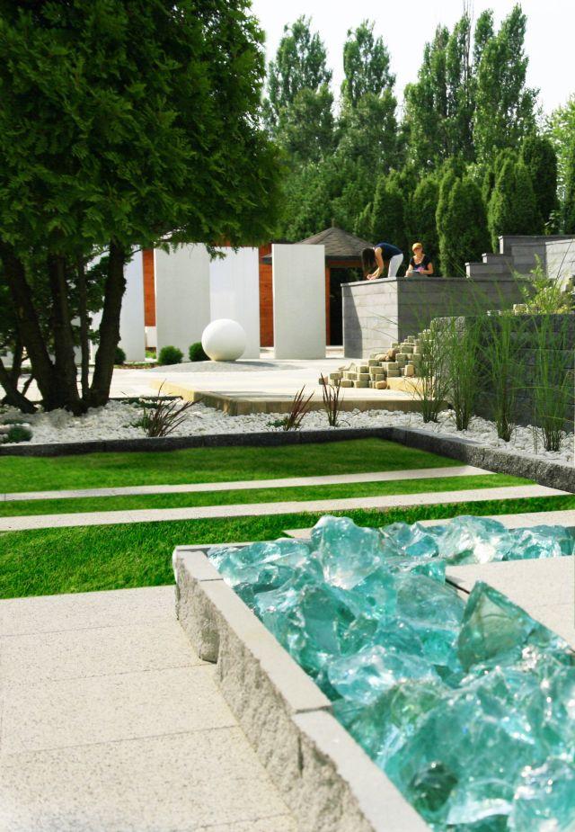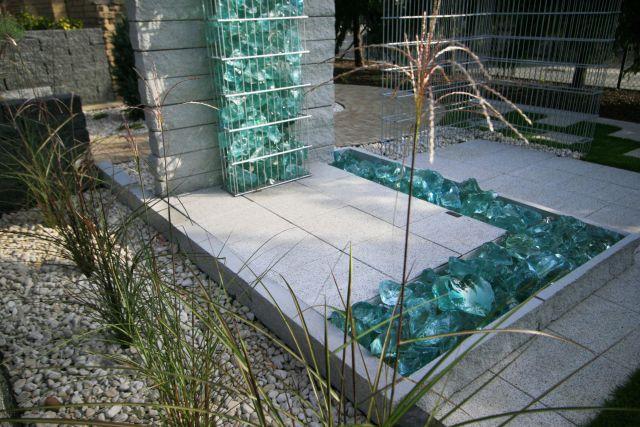 Ogród Zen charakteryzuje brak strumyków, sadzawek, które zastąpione zostają przez przemyślany układ żwiru, skał i… pustej przestrzeni – tłumaczy Joanna Skrzypek, architekt krajobrazu, designer i projektantka w firmie Libet. – Paradoksalnie, choć nieobecna fizycznie, w aranżacji woda pojawia się symbolicznie, w postaci szafirowego szkła uwięzionego w gabionach. W ten zaskakujący sposób, woda staje się głównym bohaterem suchego z założenia ogrodu.