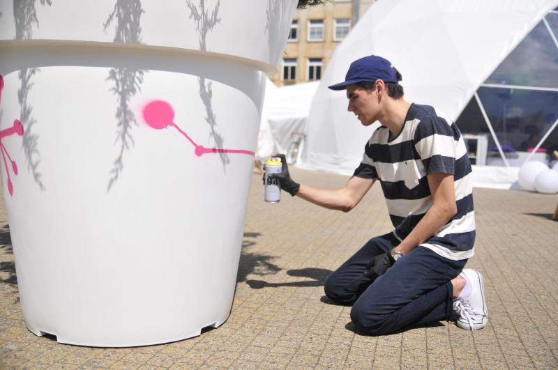 Przez cały czas trwania festiwalu Plac Wolności zdobiły kolorowe donice Gianto. Na pierwszy plan wybiło się jednak pięć śnieżnobiałych donic – to właśnie na nich artyści z grupy YOS Studio stworzyli niepowtarzalne dzieła. W ruch poszły pędzle, naklejki i rakle. Pojemniki ozdobiły litery, naklejki z najważniejszymi budynkami Poznania czy graficzne wzory przypominające oliwki. Każda donica była jedyna w swoim rodzaju.