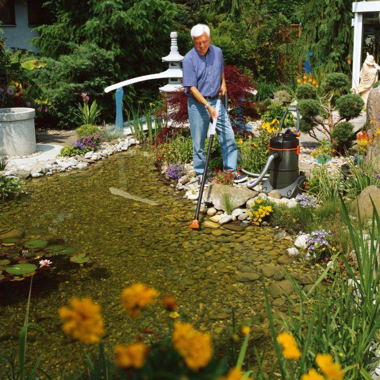 Jeżeli nasz staw zapełnił się mułem, należy użyć pompy ssącej w celu jego usunięcia. Zanim przystąpimy do tego rodzaju prac, trzeba pamiętać o zwierzętach zamieszkujących nasze oczko wodne. Przed użyciem pompy warto je przenieść do tymczasowego zbiornika, aby oszczędzić im niepotrzebnego stresu. Do wygodnego usuwania zanieczyszczeń ze stawu GARDENA poleca odkurzacz do oczka wodnego SR 2000. Dzięki niemu z łatwością usuniemy resztki roślin, muł i zalegające glony z oczka wodnego. Dodatkowo urządzenie świetnie sprawdza się jako odkurzacz do zbierania wody i nadaje się zarówno do prac w domu jak i ogrodzie, np. do czyszczenia basenów czy tarasów.