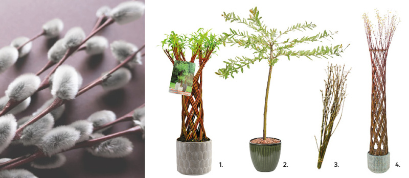 1. Wierzba pleciona warkocz 50 cm, 64,99 zł, kod 90880361, 2. Wierzba mix, 22,99 zł, kod 84895607, 3. Bazie w pęku 60-70 cm, 7,99 zł, kod 45684751. 4. Drzewko wierzba Baratta 120 cm, 119,00 zł, kod 87040962