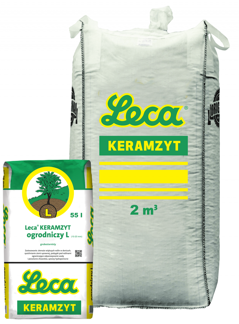 Leca® KERAMZYT ogrodniczy L (gruboziarnisty) to ekologiczne, kruszywo mineralne produkowane z gliny poprawiające właściwości gleby. Przeznaczone do uprawy roślin w donicach i w gruncie, do substratów oraz upraw hydroponicznych. Jest lekkie, porowate, mrozoodporne, odporne na działanie gryzoni, grzybów i pleśni. Stosowane do drenażu w donicach, spulchniania ziemi uprawnej, wykonywania podsypek pod roślinami, ograniczającymi odparowywanie wody i porastanie chwastów. Kruszywo jest dostarczane w workach 55 L oraz w big-bagach 2 m3. Więcej na stronie https://leca.pl/produkty/inne-zastosowania/lecar-keramzyt-ogrodniczy-l/