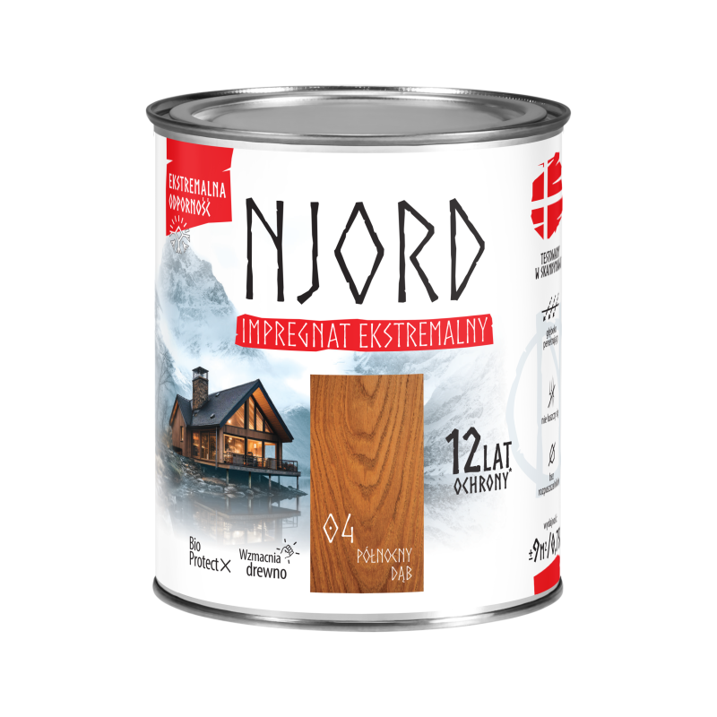 to flagowy produkt marki Njord, stworzonym z myślą o zapewnieniu maksymalnej ochrony i trwałości drewnianych powierzchni. Zaawansowana Technologia Bio ProtectX, zastosowana w Impregnacie NJORD, polega na wprowadzeniu do struktury drewna specjalnych składników, które tworzą wysoce efektywną, hydrofobową powłokę ochronną. Ta bariera nie tylko chroni przed wodą, ale także zapobiega wnikaniu zanieczyszczeń oraz powstawaniu pleśni i grzybów. Dzięki temu drewno pozostaje suche i bezpieczne nawet w najtrudniejszych warunkach pogodowych, aż do 9 lat. Impregnat NJORD zawiera specjalne pigmenty, które skutecznie odbijają promieniowanie UV, chroniąc drewno przed blaknięciem i uszkodzeniami wywołanymi przez słońce. Ta właściwość zapewnia, że drewniane powierzchnie zachowują swój pierwotny kolor i wygląd przez wiele lat, bez potrzeby częstego odnawiania. Impregnat NJORD został zaprojektowany z myślą o łatwości aplikacji. Jego unikalna formuła sprawia, że nakładanie jest proste i szybkie, a powłoka równomiernie się rozprowadza, eliminując ryzyko powstawania smug i niedoskonałości. Ponadto, produkt jest bezpieczny dla użytkowników i środowiska, ponieważ nie zawiera szkodliwych rozpuszczalników ani innych niebezpiecznych substancji.