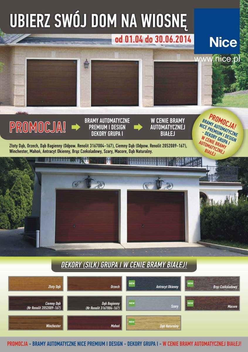 Promocyjne bramy garażowe Nice dostępne są z siłownikami Nice Spin 21 i Nice Spin 41 (w zależności od wymiaru bramy). Spin to linia nowoczesnych siłowników do bram garażowych z napędem paskowym zapewniającym cichą i płynną obsługę bramy. Na życzenie klienta możliwa jest również automatyzacja promocyjnej bramy garażowej przy użyciu napędu KINGgates. To linia rozwiązań automatyki do bram wjazdowych i garażowych – bezpieczne i praktyczne produkty oparte na nowoczesnych rozwiązaniach technicznych. W 2011 roku, w wyniku akwizycji, marka KINGgates została członkiem grupy Nice. W zależności od wymiaru bramy w wiosennej promocji stosowane są siłowniki Ovo 550 lub Book 1000.